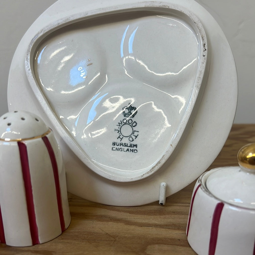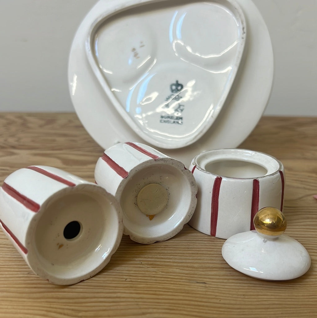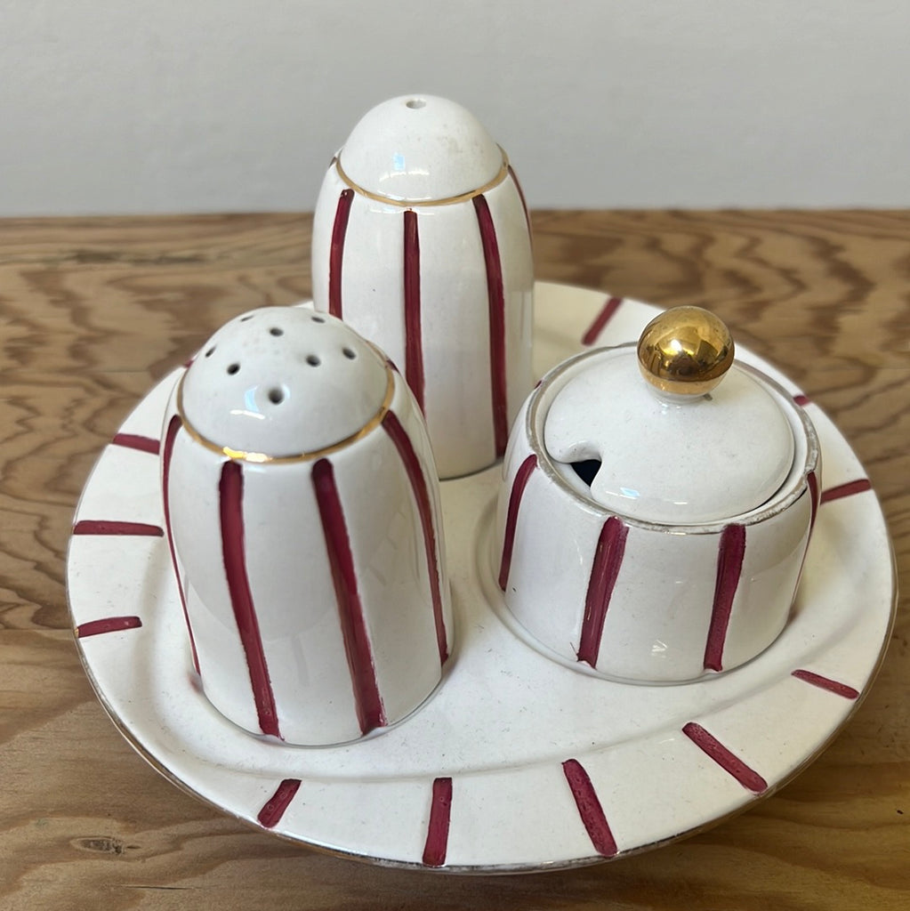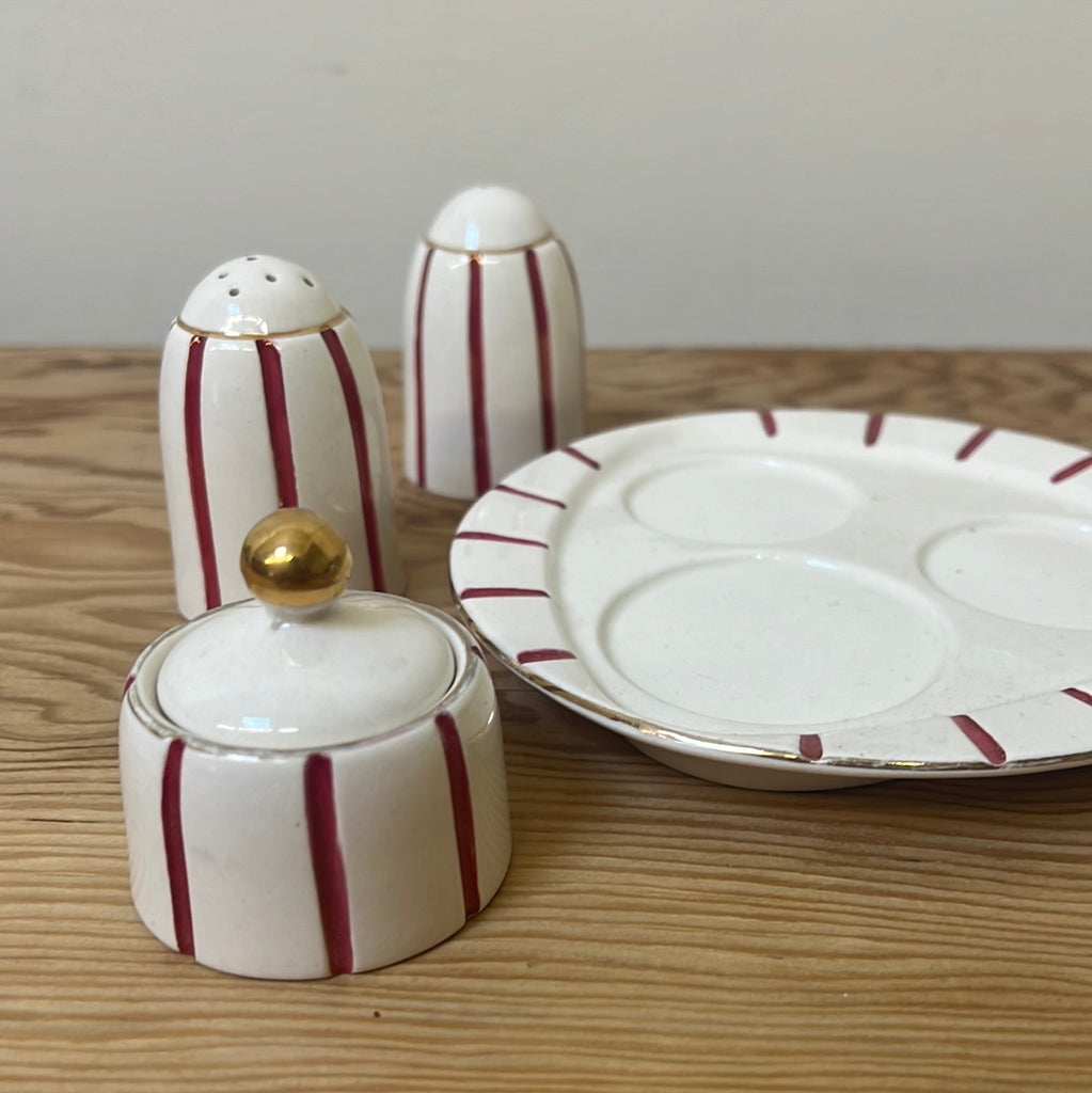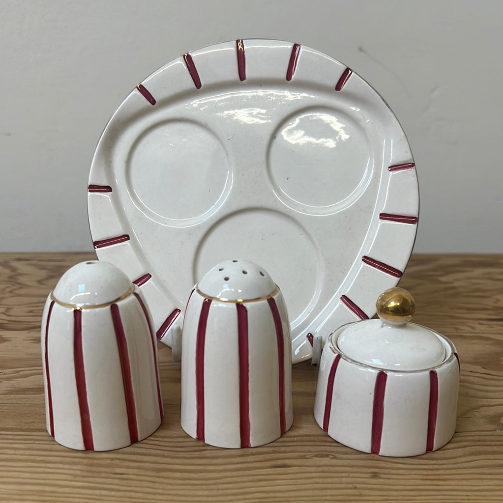 For piece cruet set featuring plate, salt, pepper and condiment. Thin red stripe on white with gold detailing. As pictured, salt shaker cap is broken and inside pot. Price reflects this collectors piece.