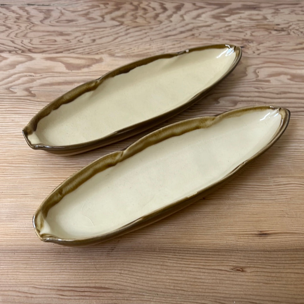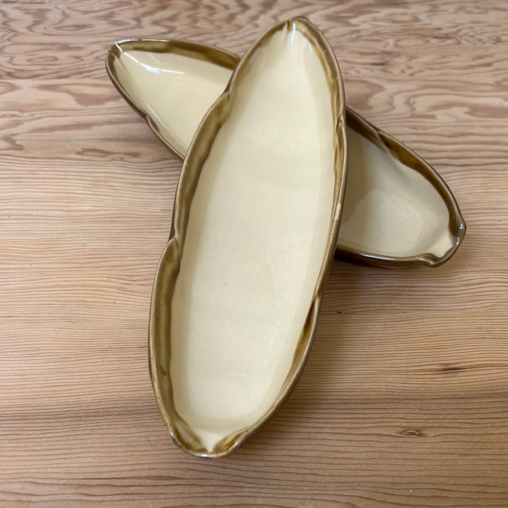 T.G Green Church Gresley Corn on the Cob dishes. Sold separately, these kitsch little corn serving dishes can be used for just about anything. Lovely neutral colours and bagette shape.