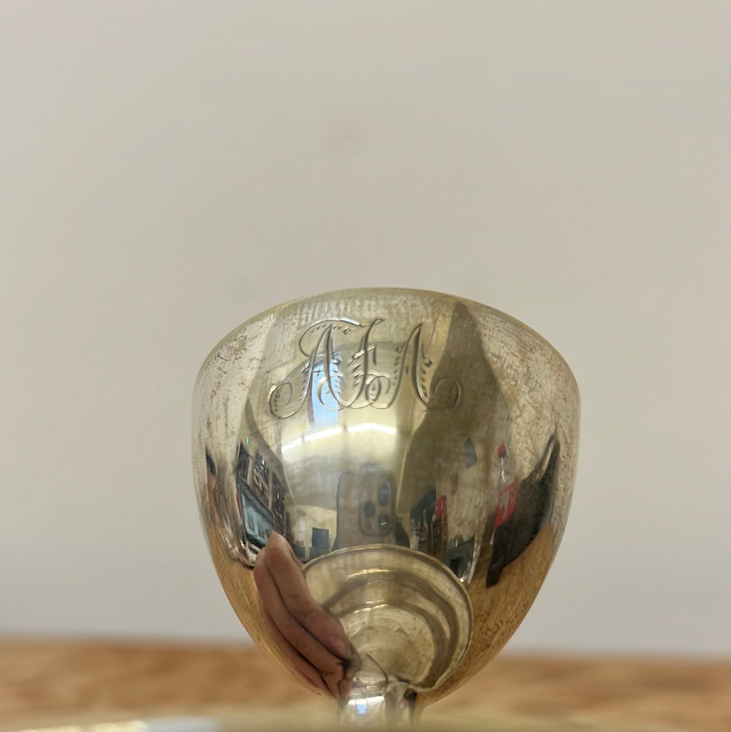 Dainty little egg cup with soldier holder. Initial engraving on cup. ‘AJA’