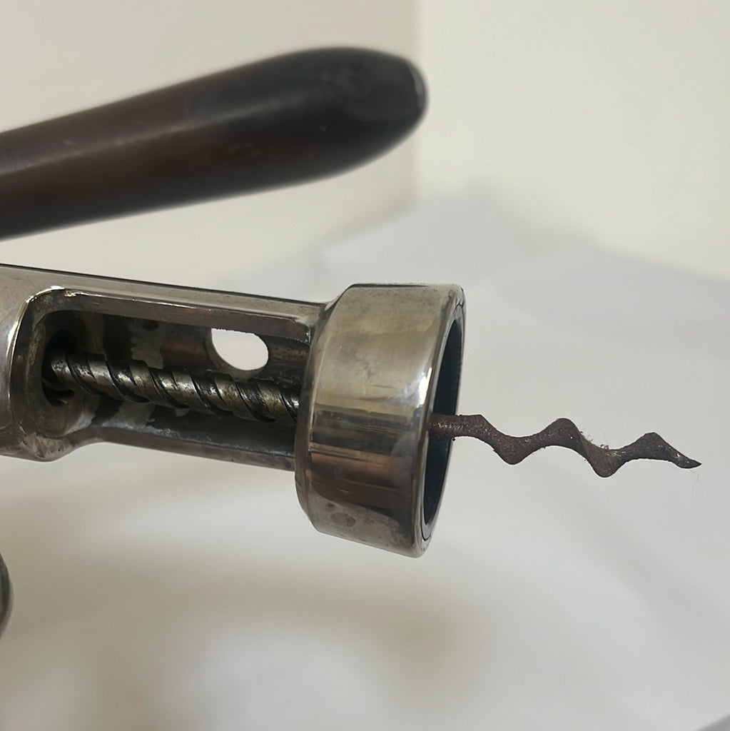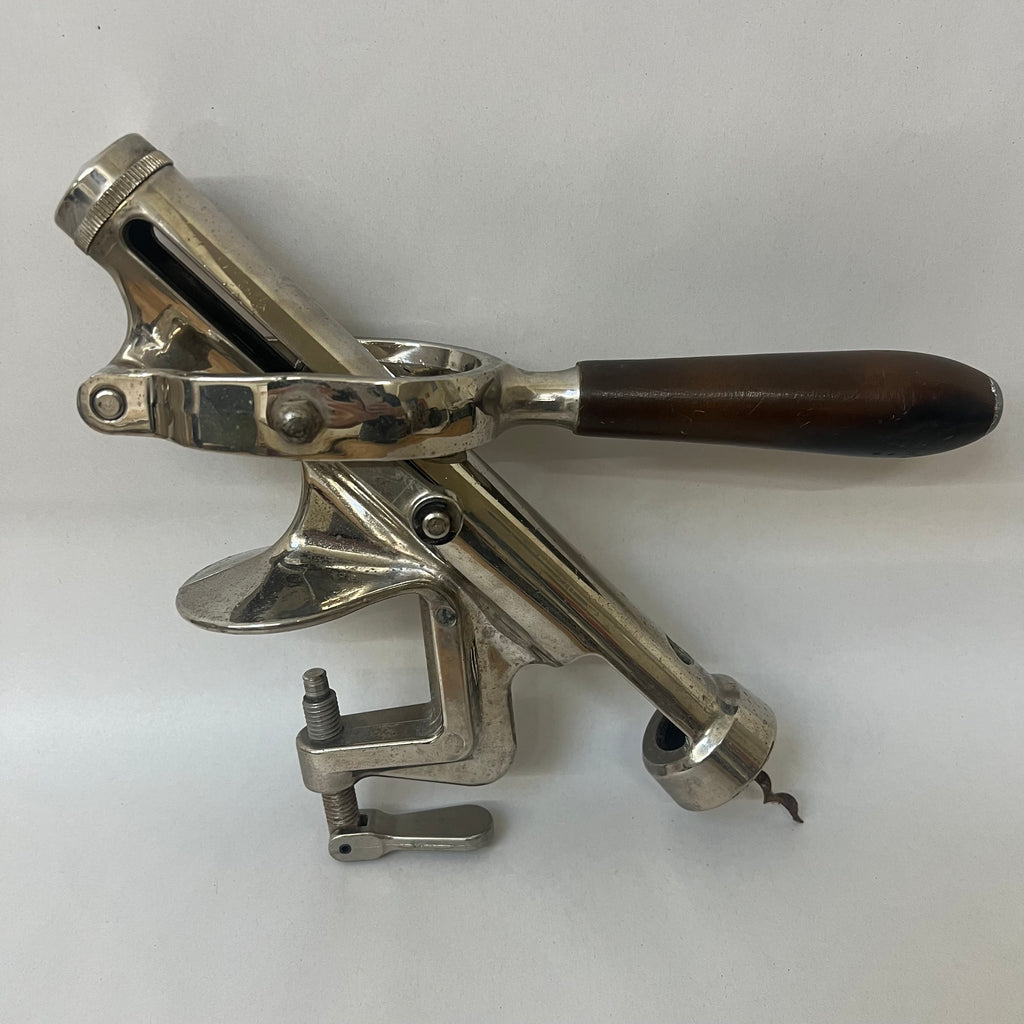 Easily tabletop clamp mounted, this old school corkscrew bottle opener is sure to elevate the look of your home bar or mancave. ‘RAPID’ Swiss made and sturdy with wooden handle.