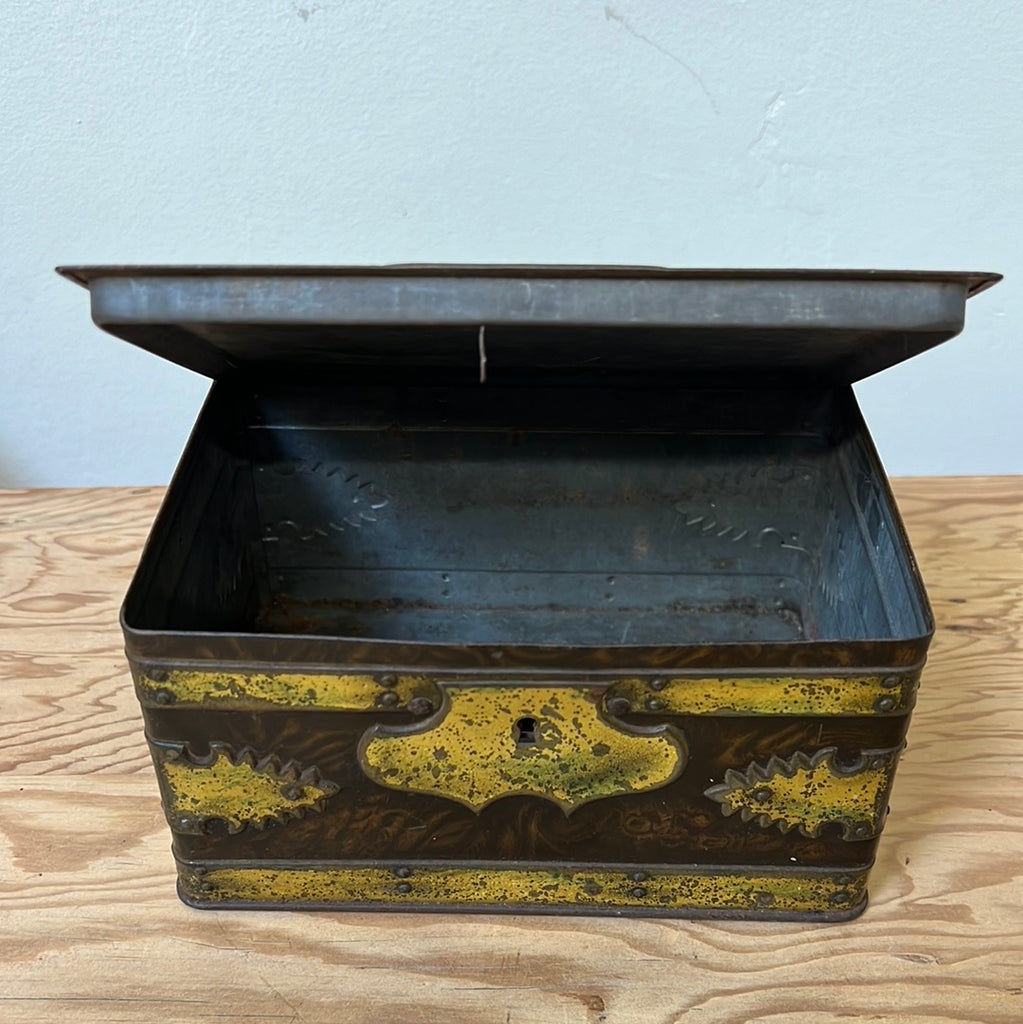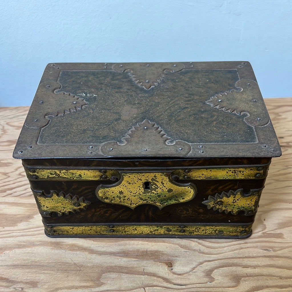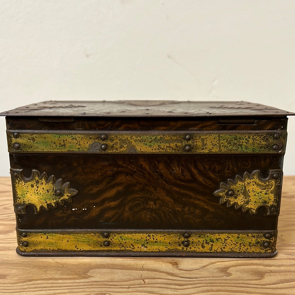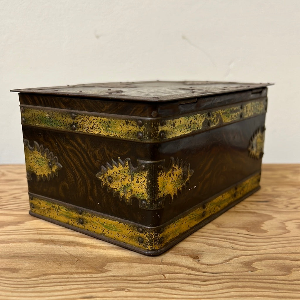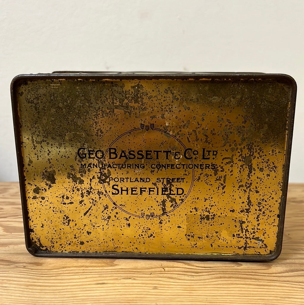 Bassett & Co sweet tin. Brown and gold tarnished tin. Ornate detailing, treasure chest style. ‘Geo Bassett & Co Ltd. Manufacturing Confectioners. Portland Street, Sheffield’
