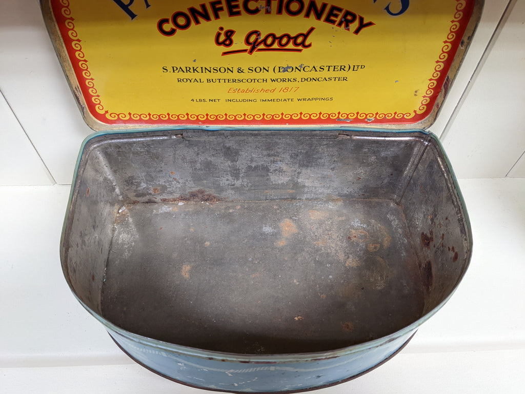 Crafted to advertise Parkinson's Confectionery of Doncaster, England, this gorgeous large rustic tin is great for a multitude of purposes nowadays! Great for a collector of tin and storage boxes.