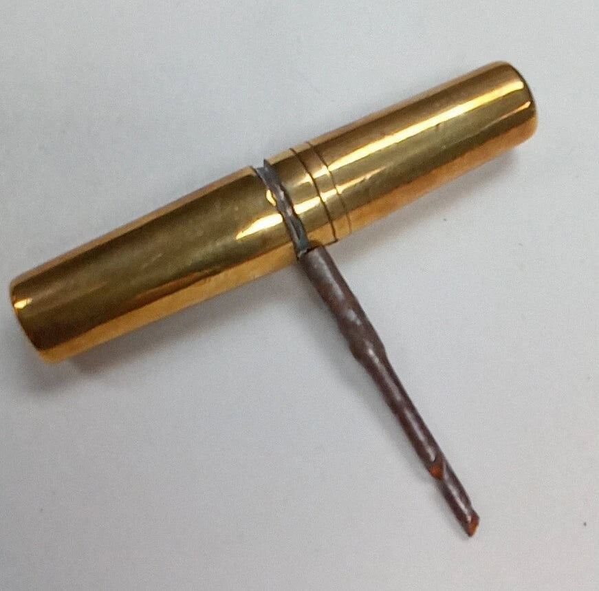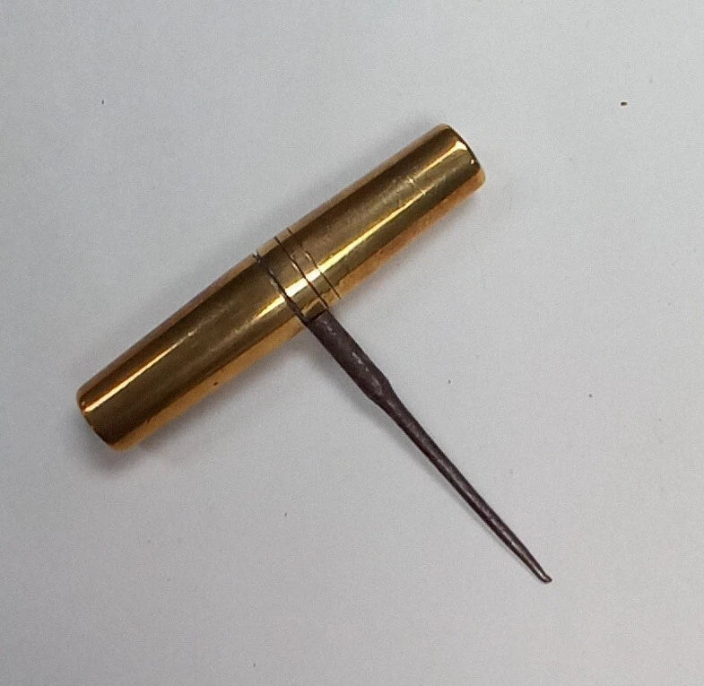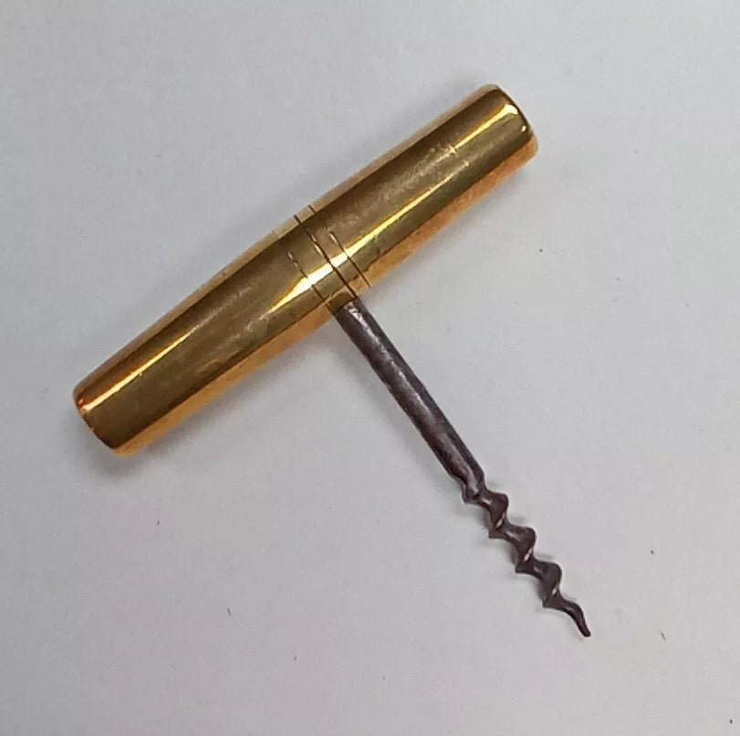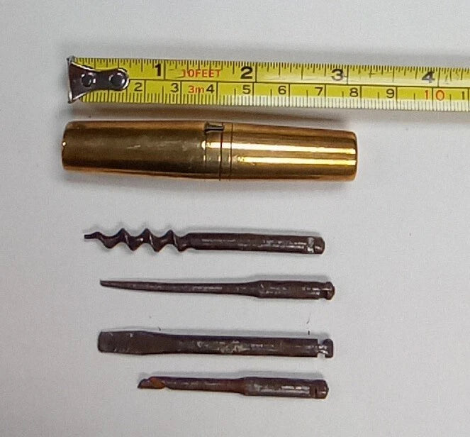 A fascinating vintage miniature brass tool kit by Forum & Co. of Birmingham. Ingeniously designed, the holder also serves as the handle for an interchangeable corkscrew, screwdriver and stone pick.