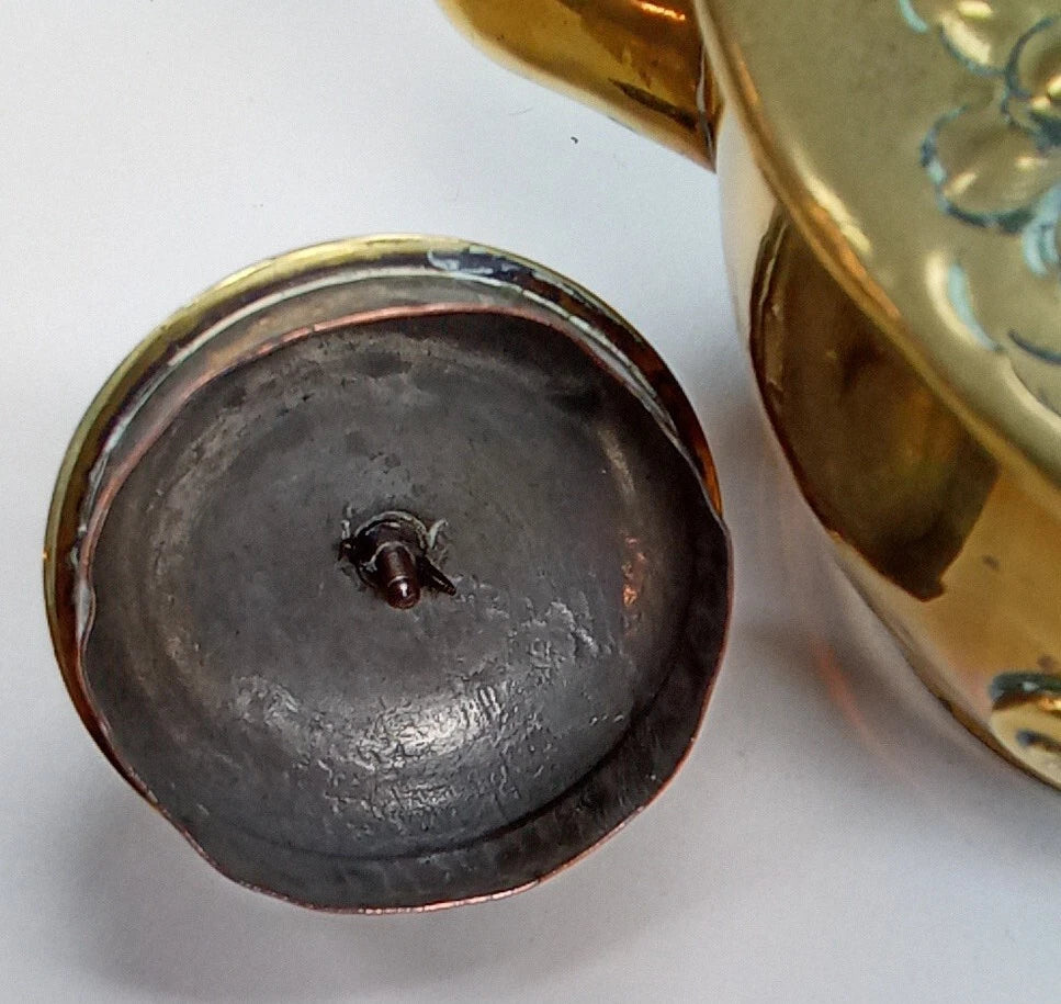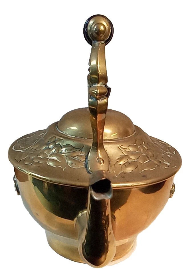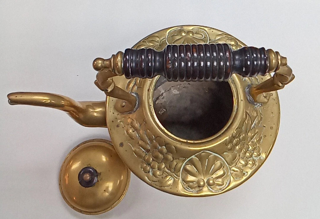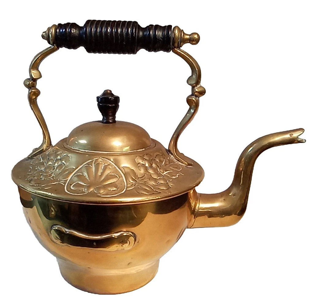 A decorative vintage brass kettle featuring beautiful detailing and a hardwood handle and lid knob. Its natural patina adds character and charm, making it an appealing addition to any rustic or antique style home.