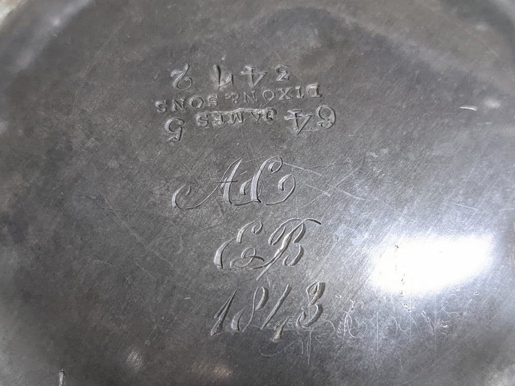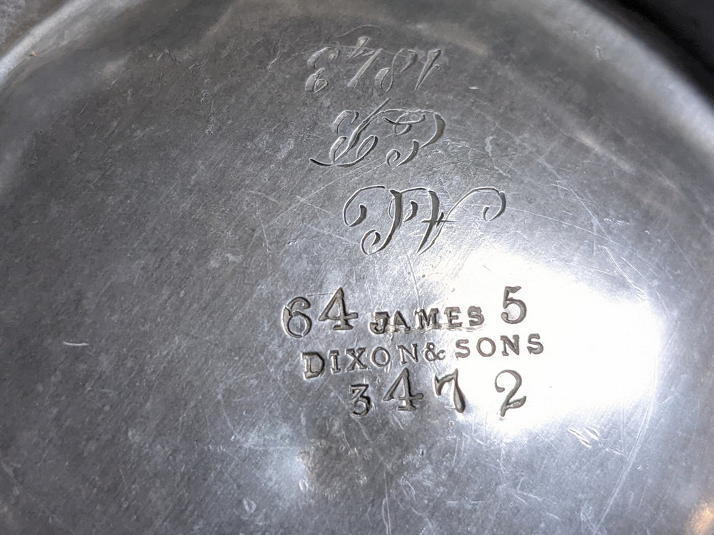 Stamped on the base is "JAMES DIXON & SONS", and engraved are three sets of initials alongside the date 1843.