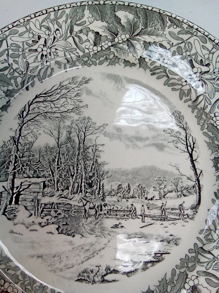 Made by Adams, England, for the American market, this plate depicts a winter scene including a horse, dog and men on the ice and snow, with the design on the plate's edge with holly and mistletoe decoration. The design taken from a lithograph.