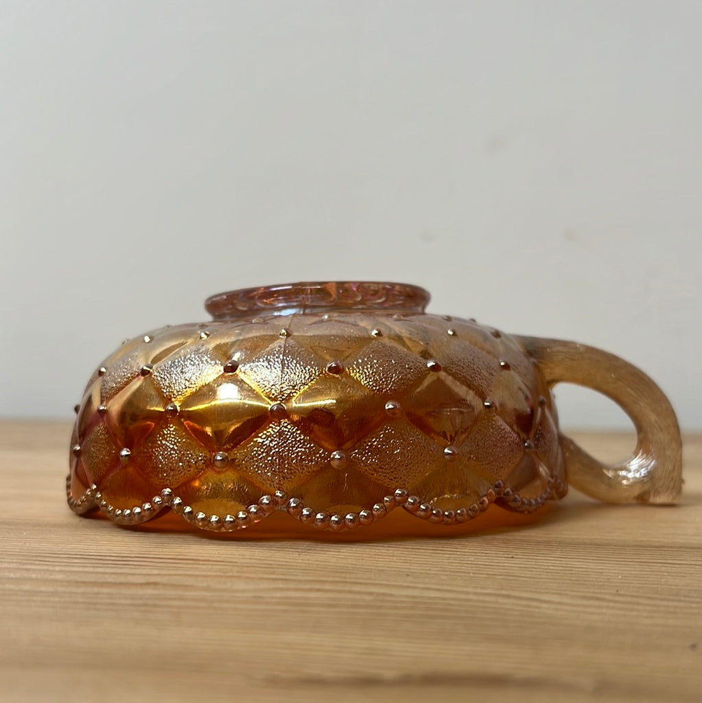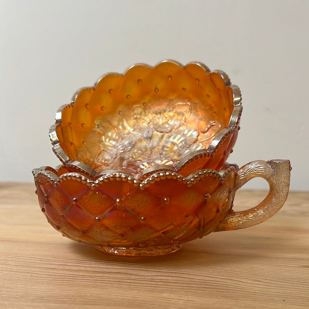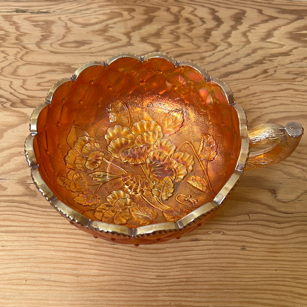 With gold scalloped edges, twig style handles, and florals, these lovely iridescent peach carnival glass dishes are truly unique. Pair with our almost matching Punch Bowl set or start your collection now!