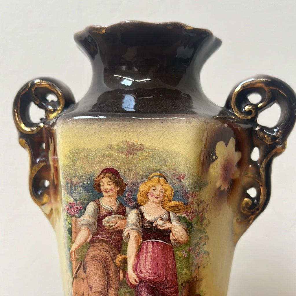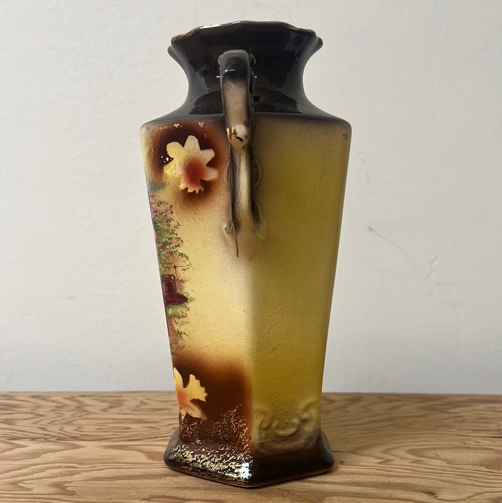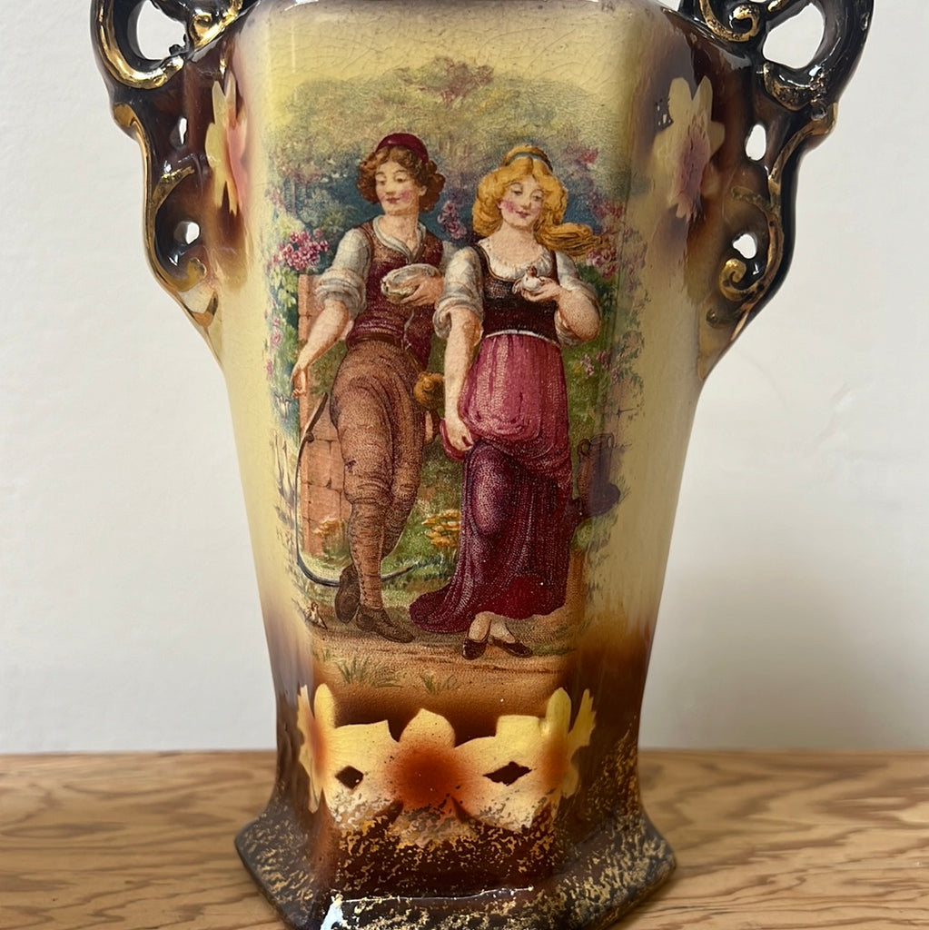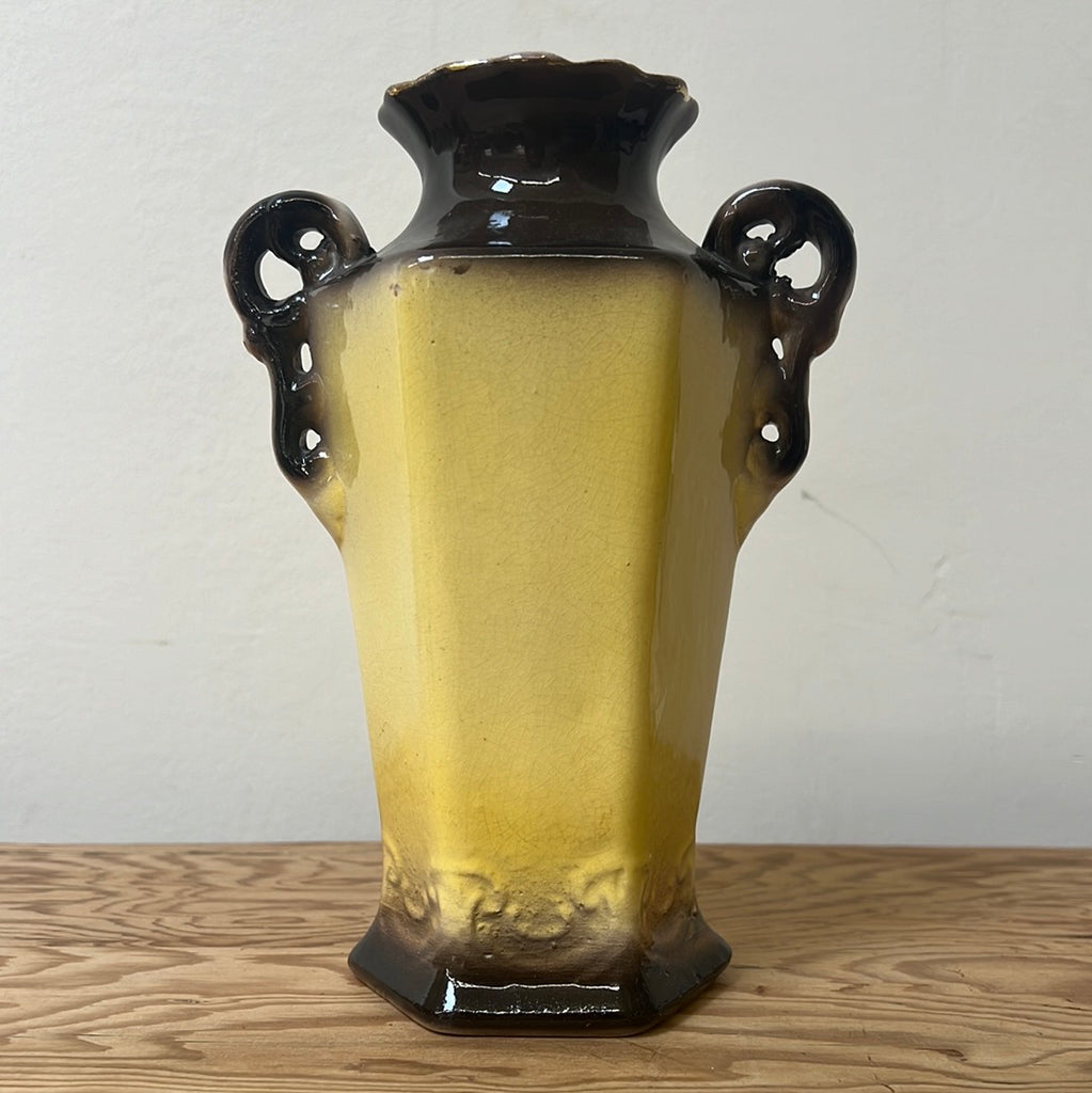 Dress up your fireplace with this pair of mantle vases featuring two designs of similar nature. With gold speckles and embellishments on handles, hexagonal shape, and scalloped lip.