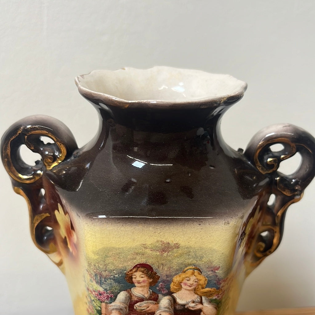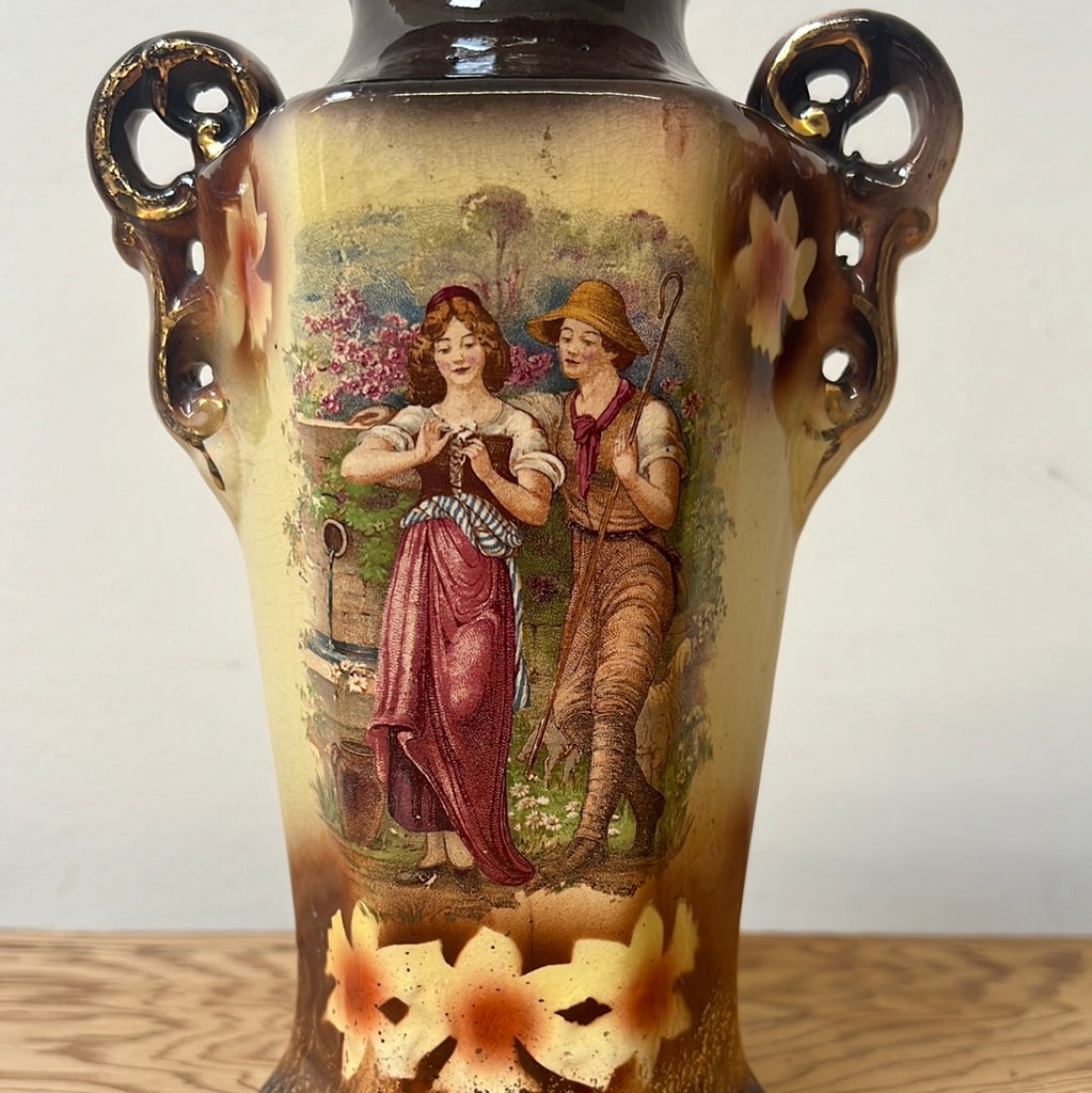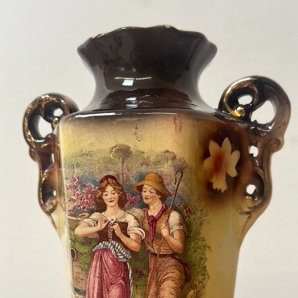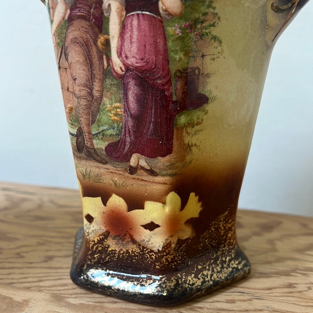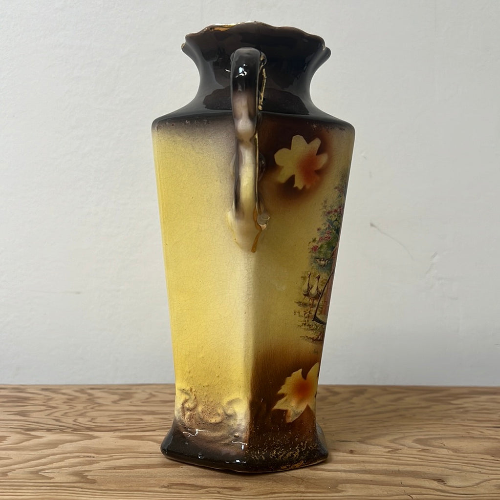 Dress up your fireplace with this pair of mantle vases featuring two designs of similar nature. With gold speckles and embellishments on handles, hexagonal shape, and scalloped lip.