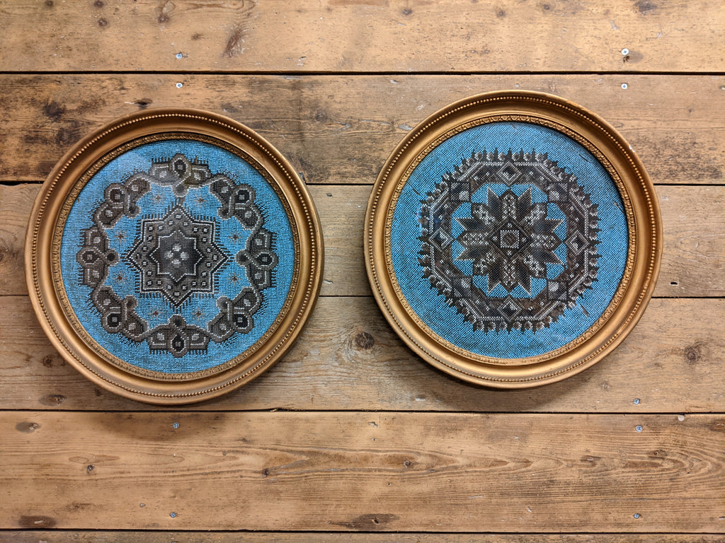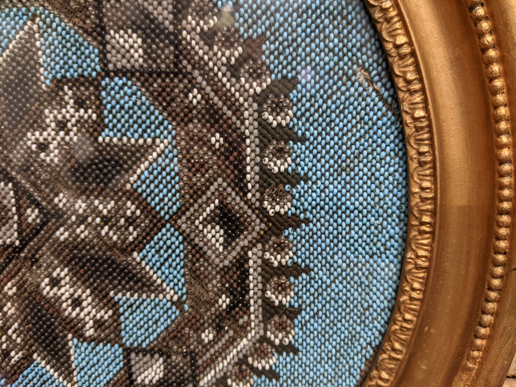 This stunning Victorian tapestry boasts Venetian glass rods that have been sliced into individual miniature glass beads and then hand sewn onto fabric. Complete with a lovely circular gold frame, it’ll take pride of place on any wall!