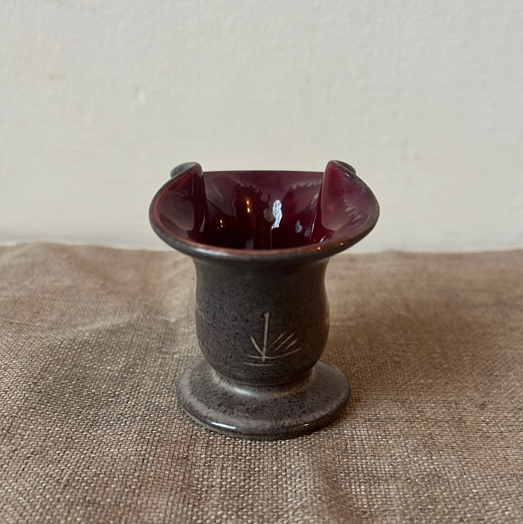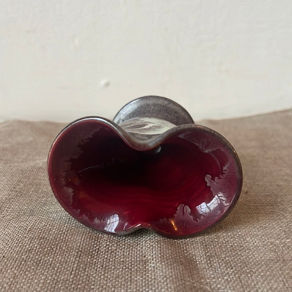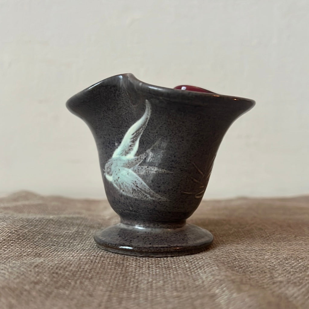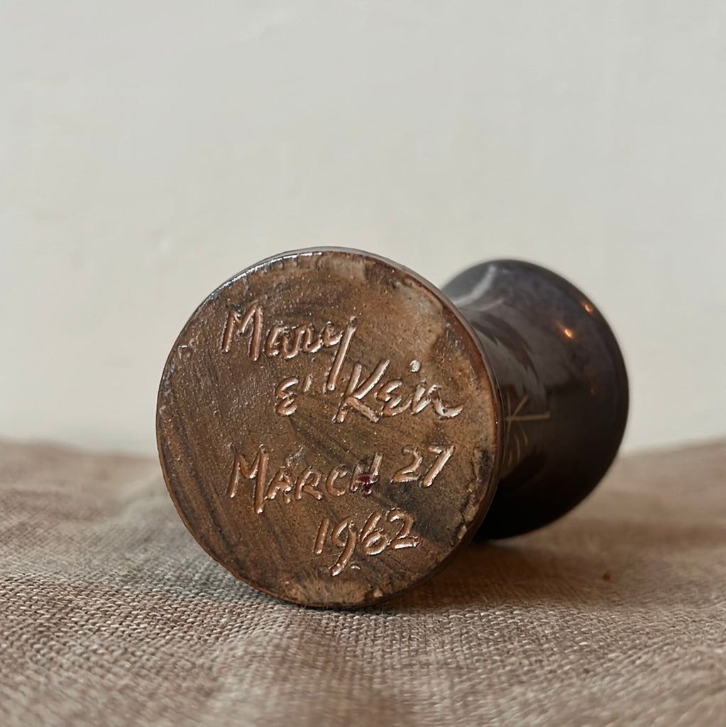 ‘Mary & Ken. March 27. 1962’. Small sentimental handmade pot with unique lemniscate shape and sparrow paintings.