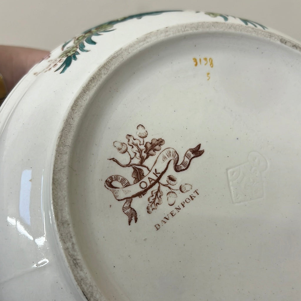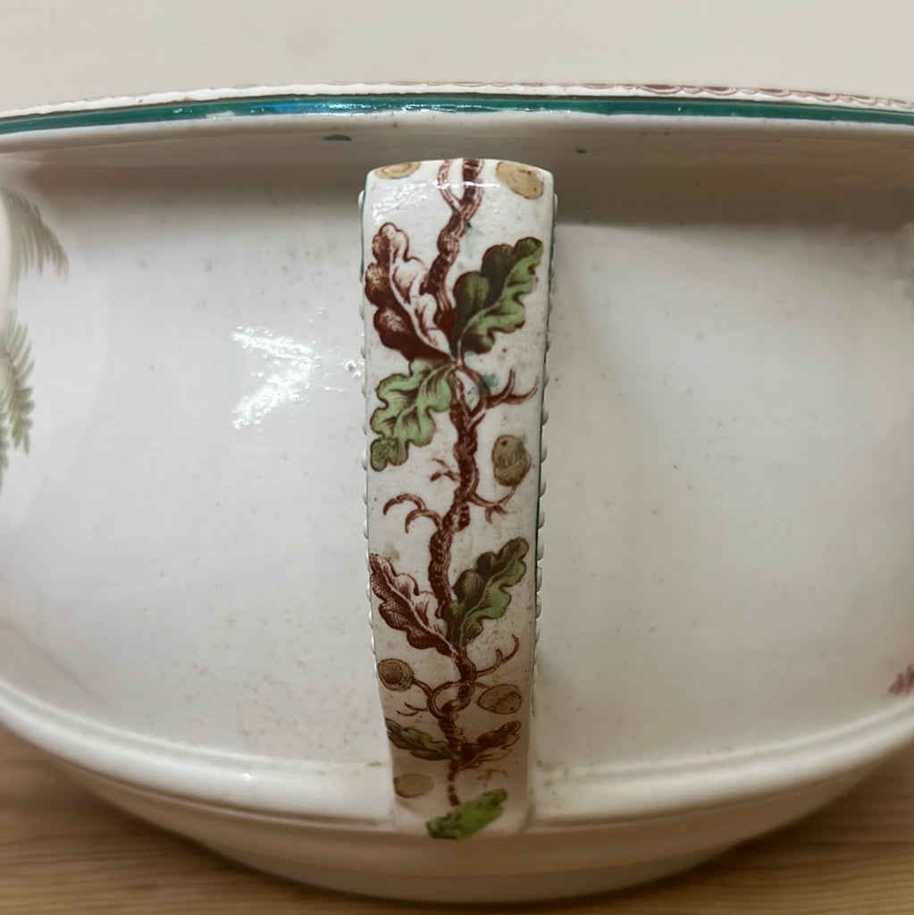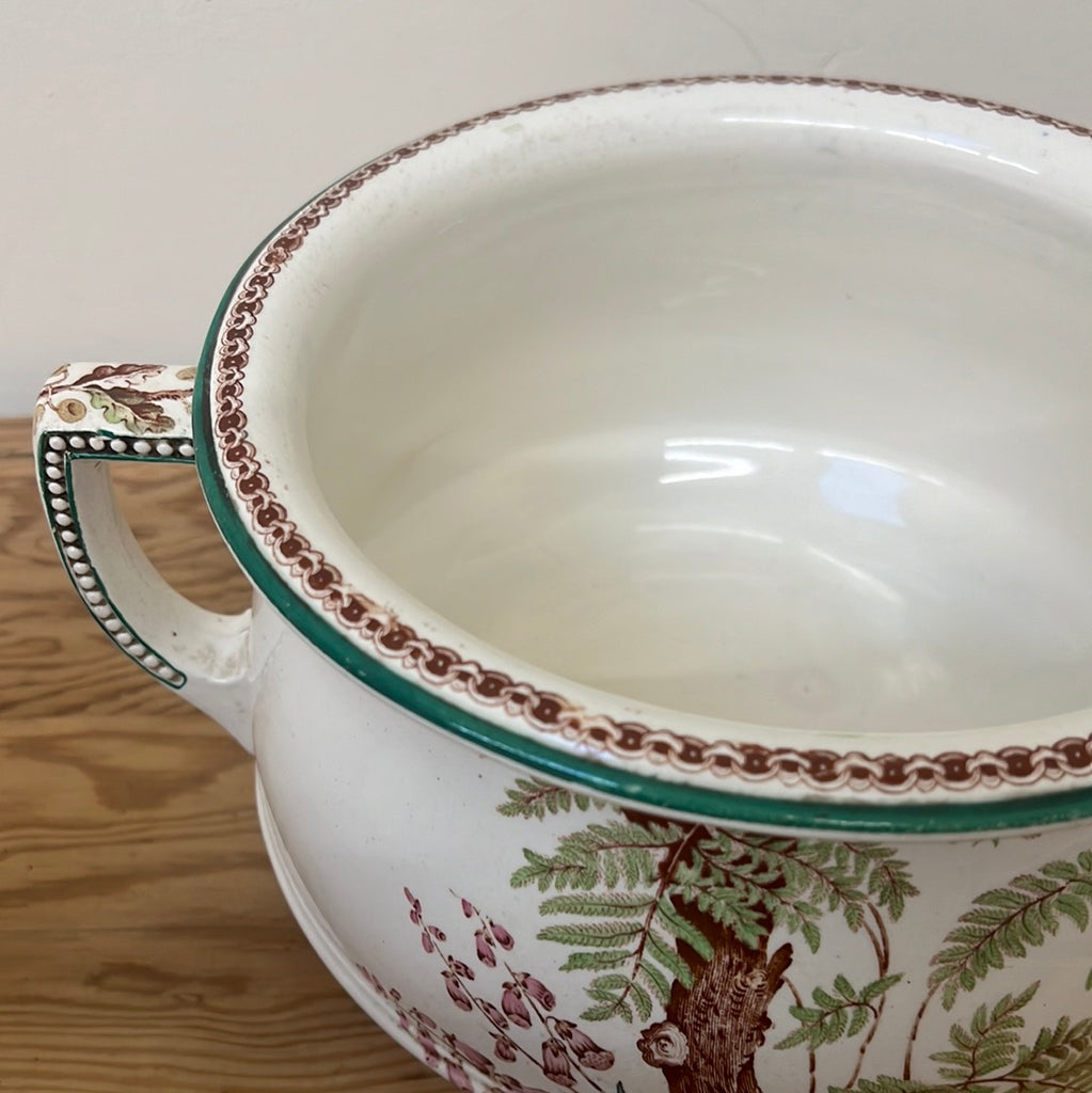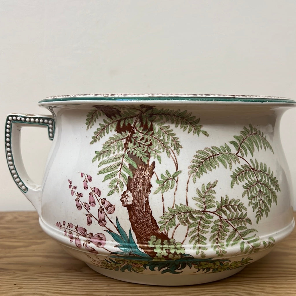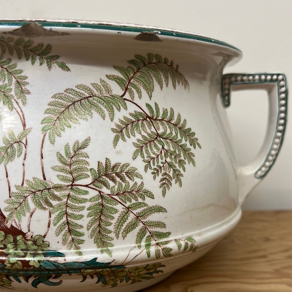 Large ceramic pot with foliage and florals. Would make a lovely planter! Slight chips to underside rim.