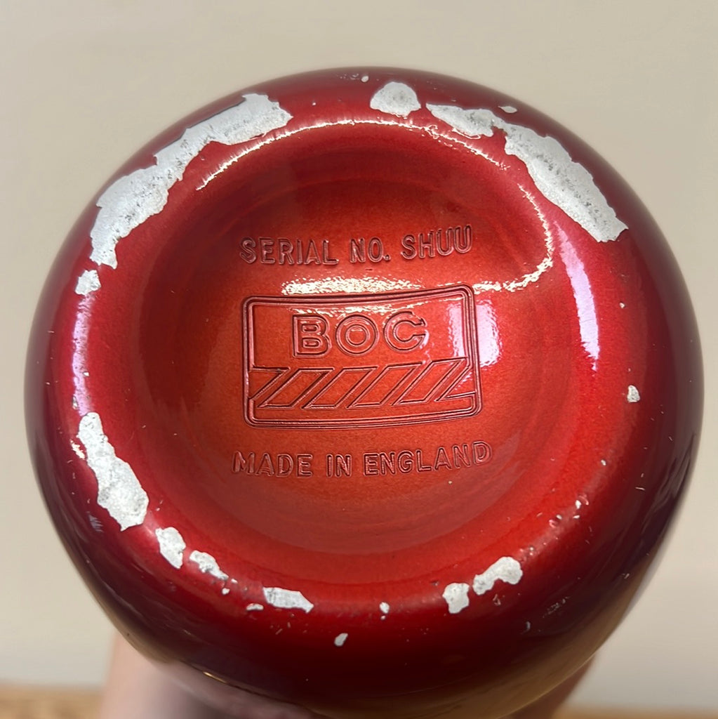 Pearlised red BOC soda syphon. This decorative piece would look great on a home bar or in a man cave!
