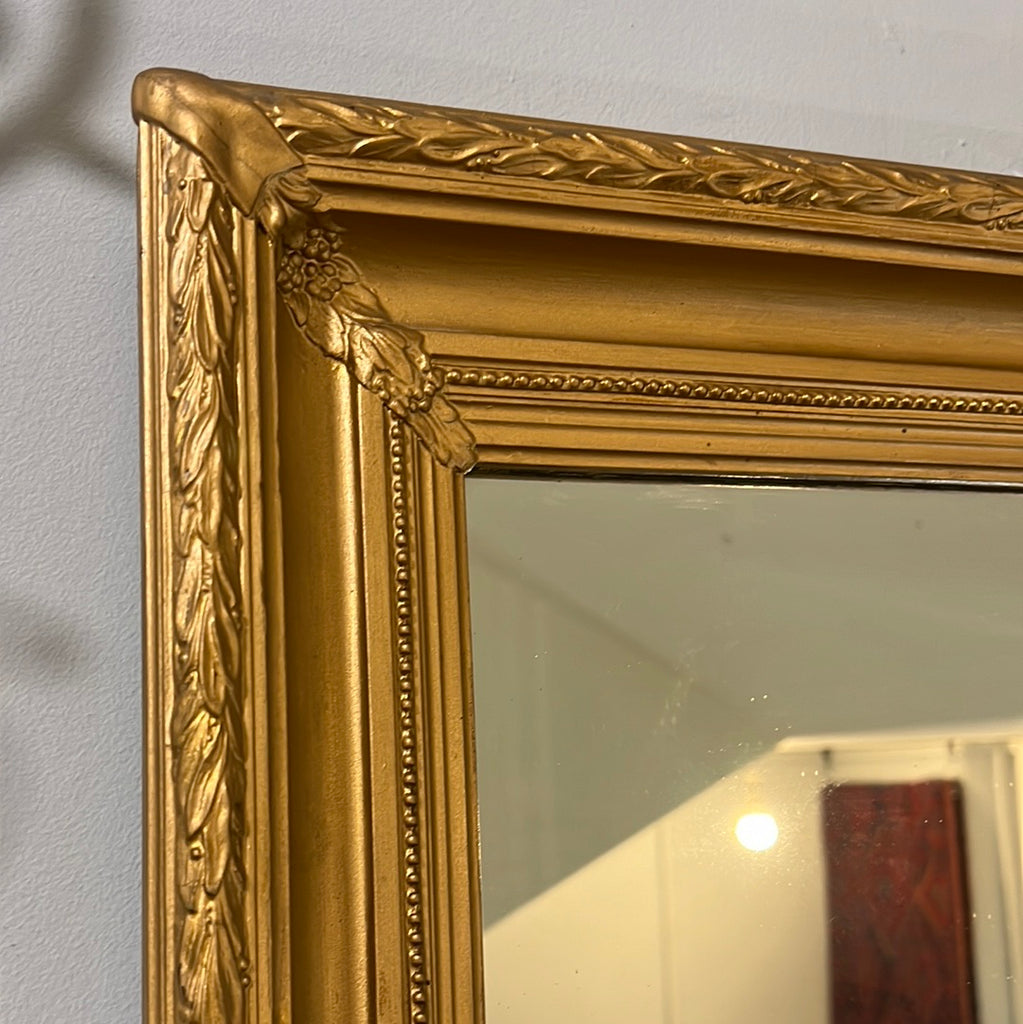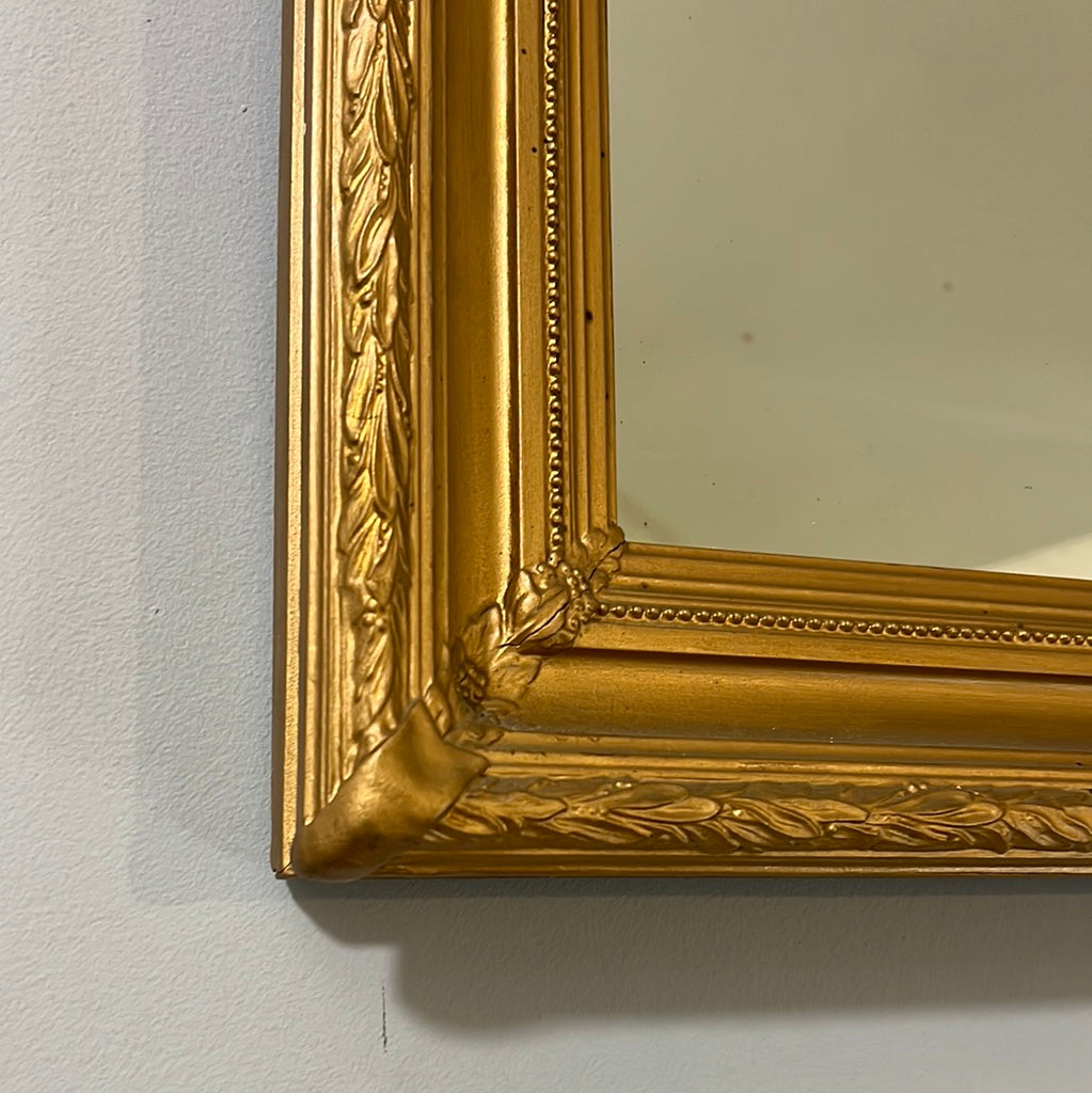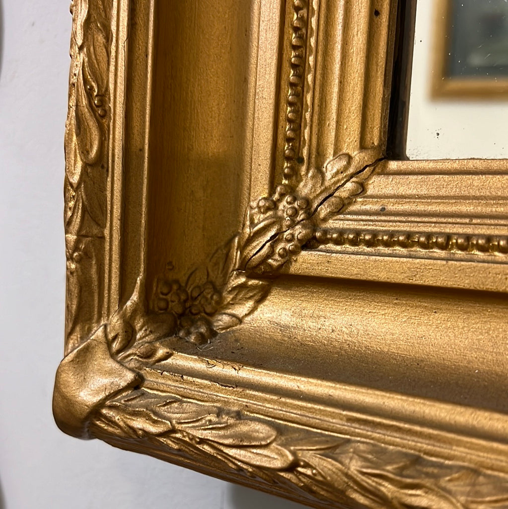 Rustic golden mirror with aging and slight de-silvering. Beautiful gold painted ornate double frame.