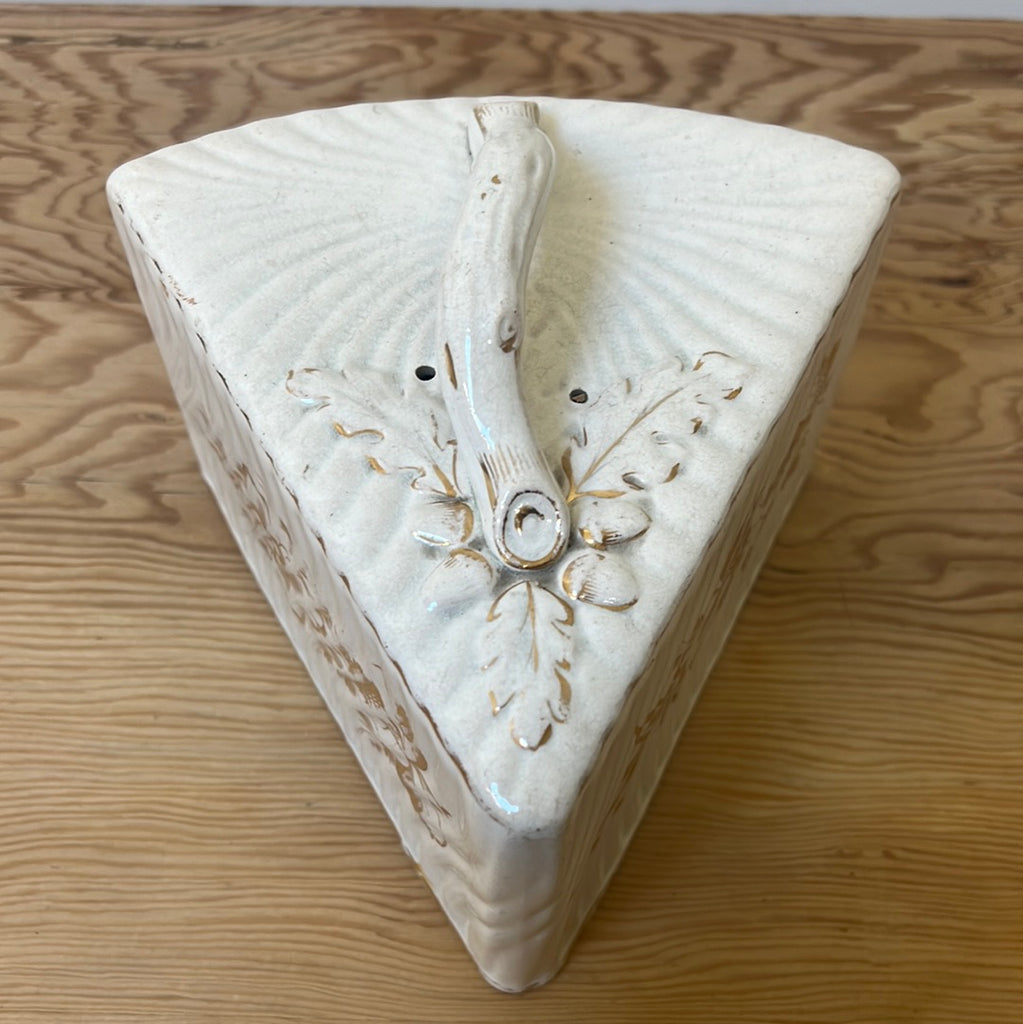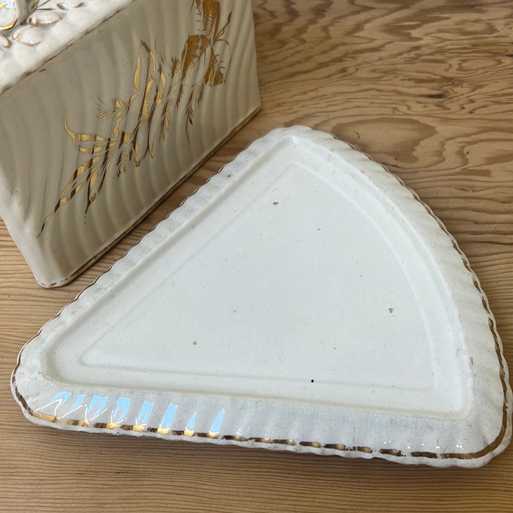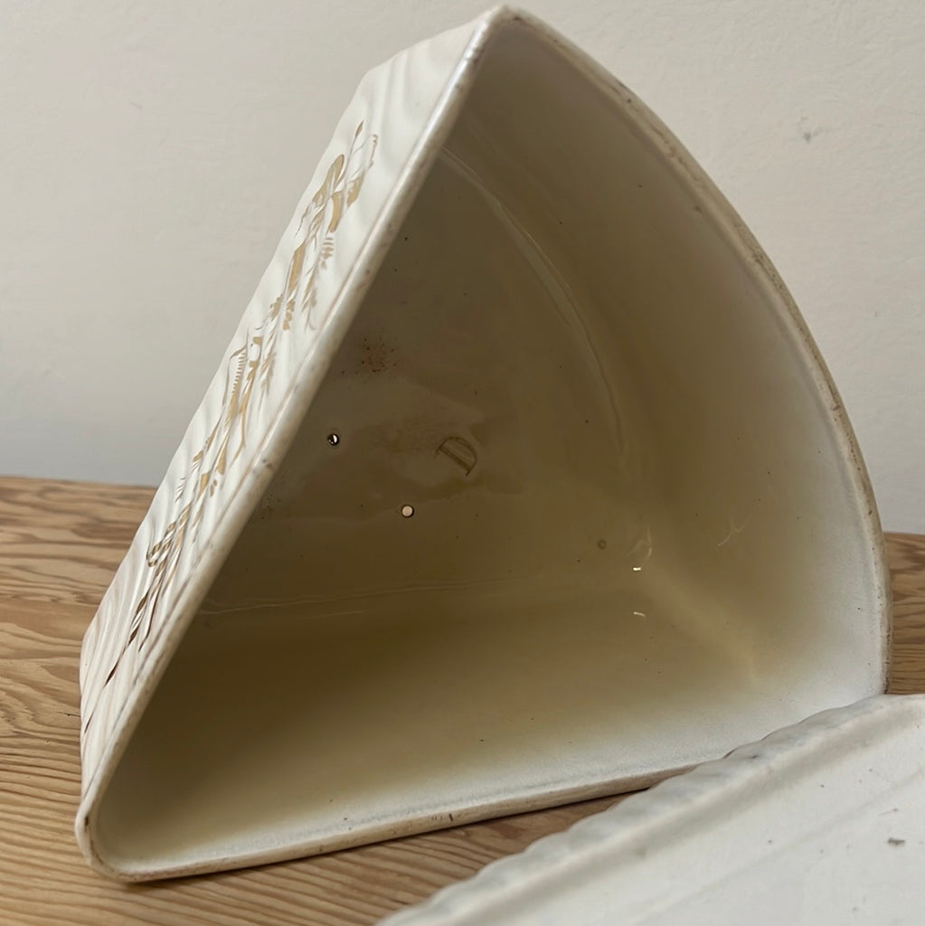 Large cream and gold cheese cover. Triangular shape with wave pattern and scalloped edges. A lovely table piece for decorative or functional use.