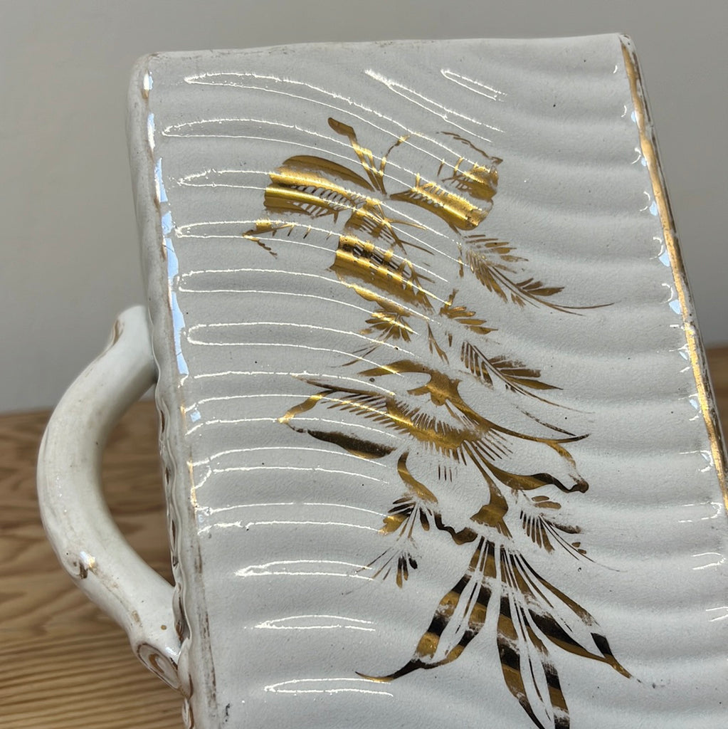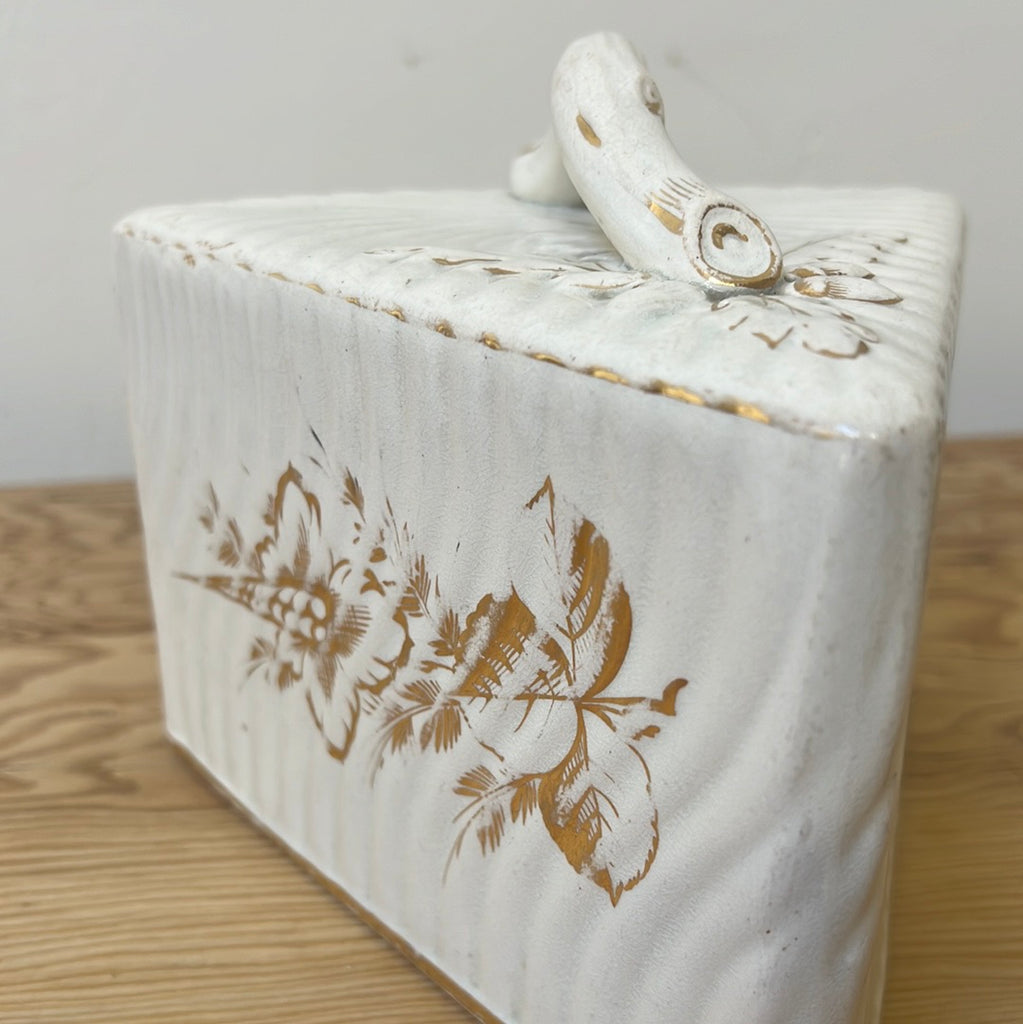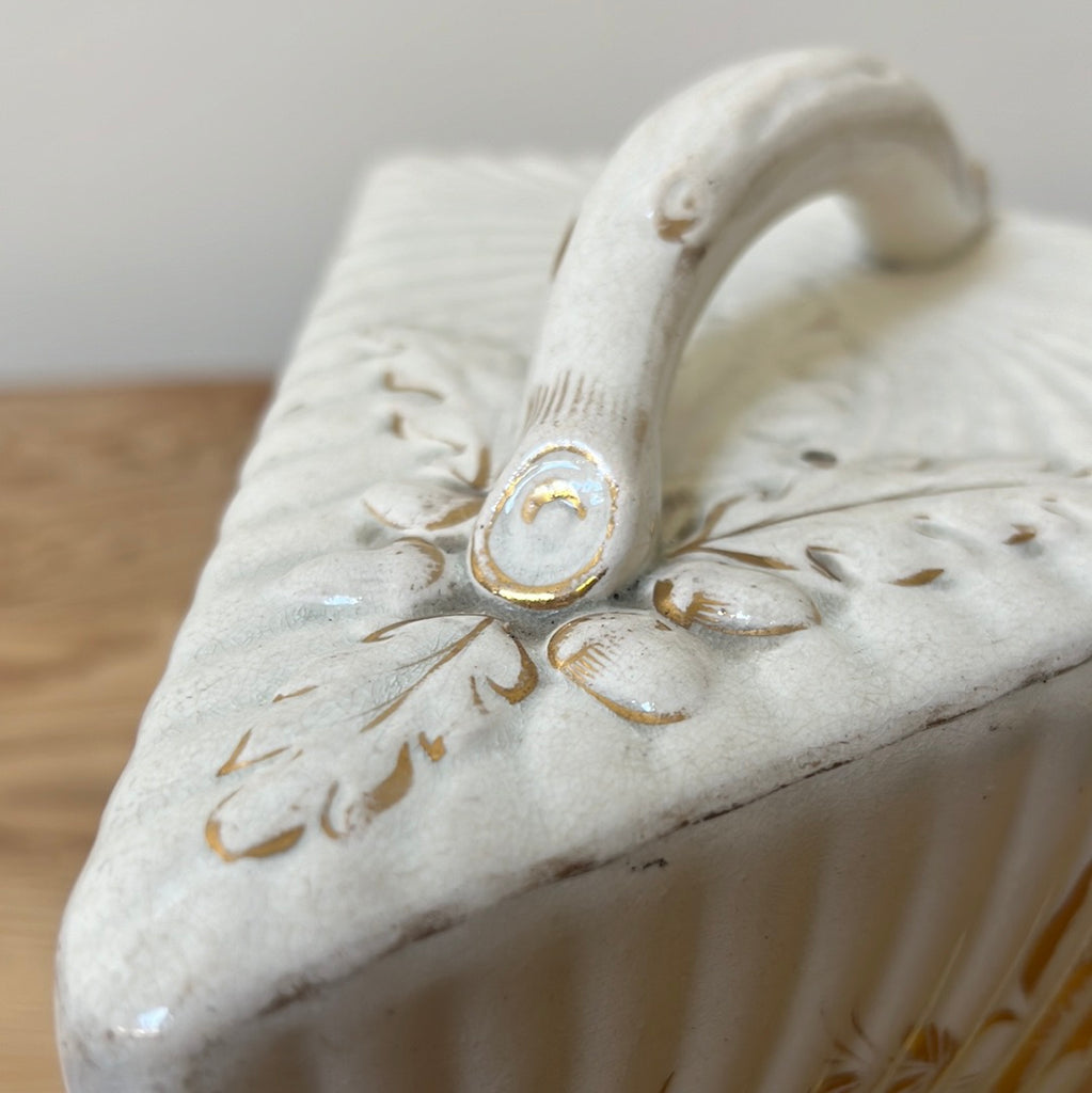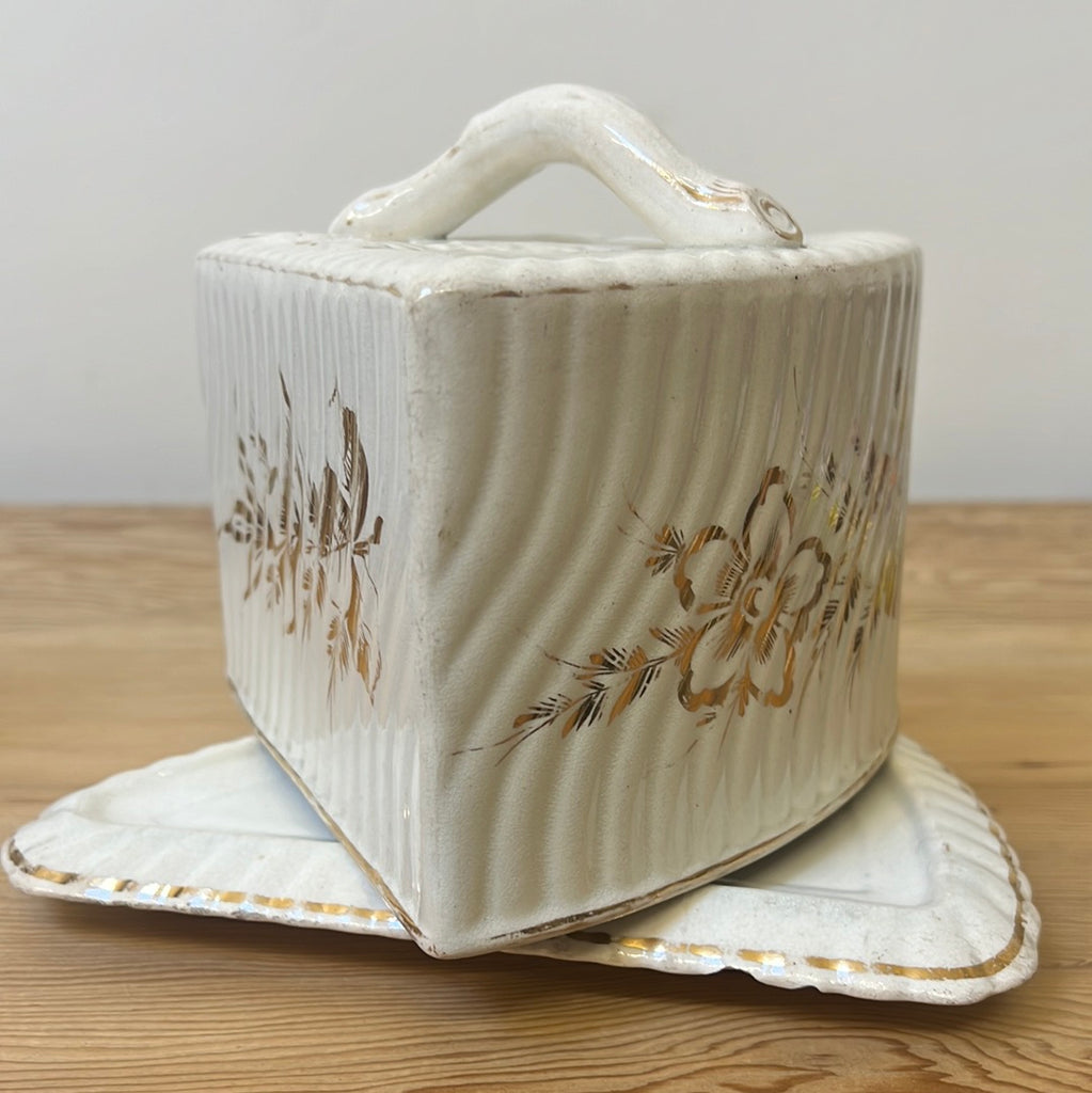 Large cream and gold cheese cover. Triangular shape with wave pattern and scalloped edges. A lovely table piece for decorative or functional use.