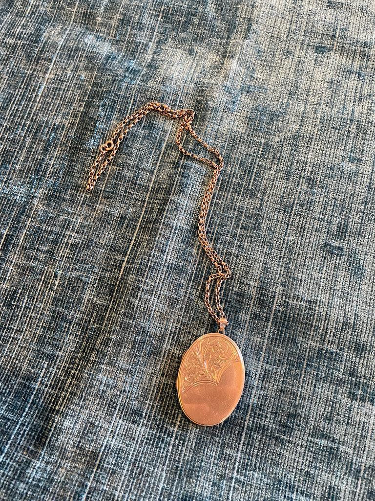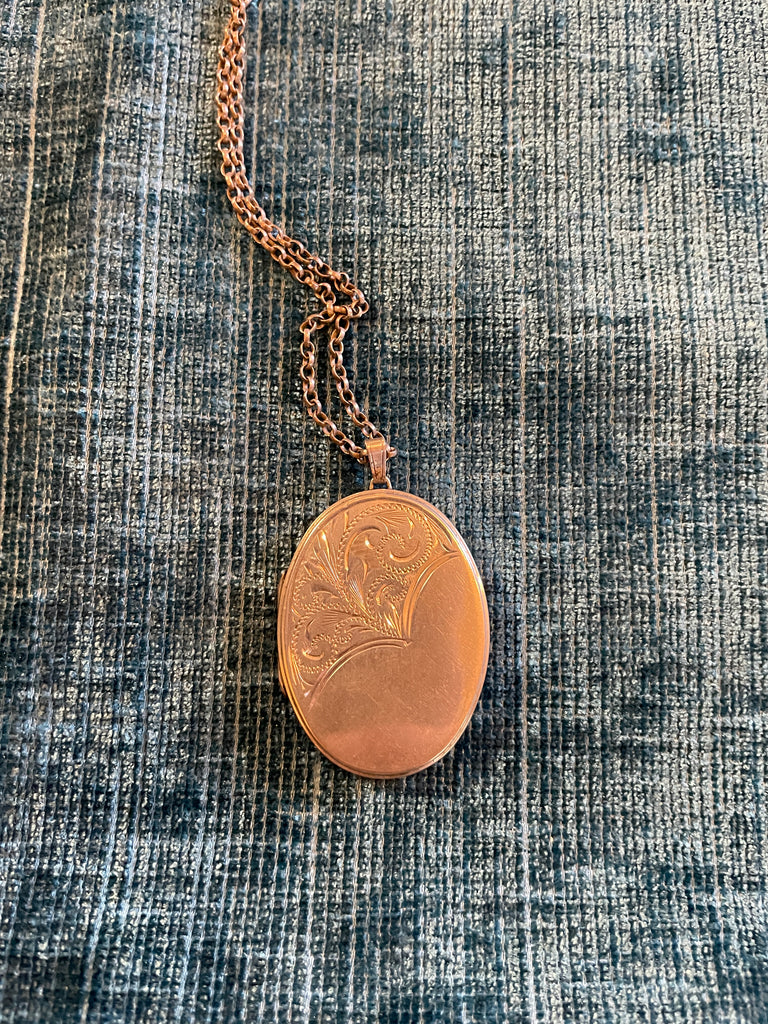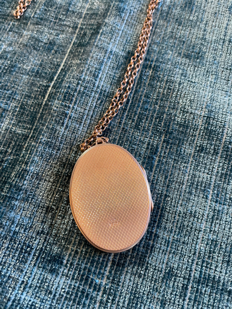 A beautiful vintage silver locket on a 20-inch chain secured with a bolt spring ring clasp. The oval-shaped locket features a delicate scroll decoration engraved on the front, while the back is adorned with an intricate all-over pattern and bears its silver hallmark.