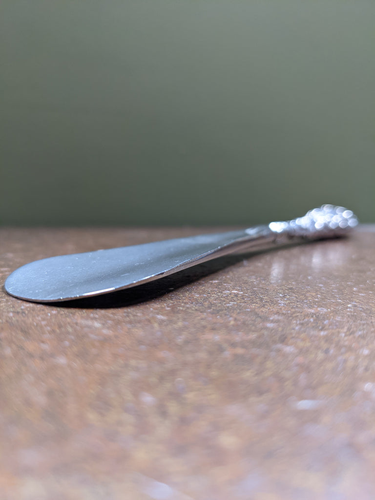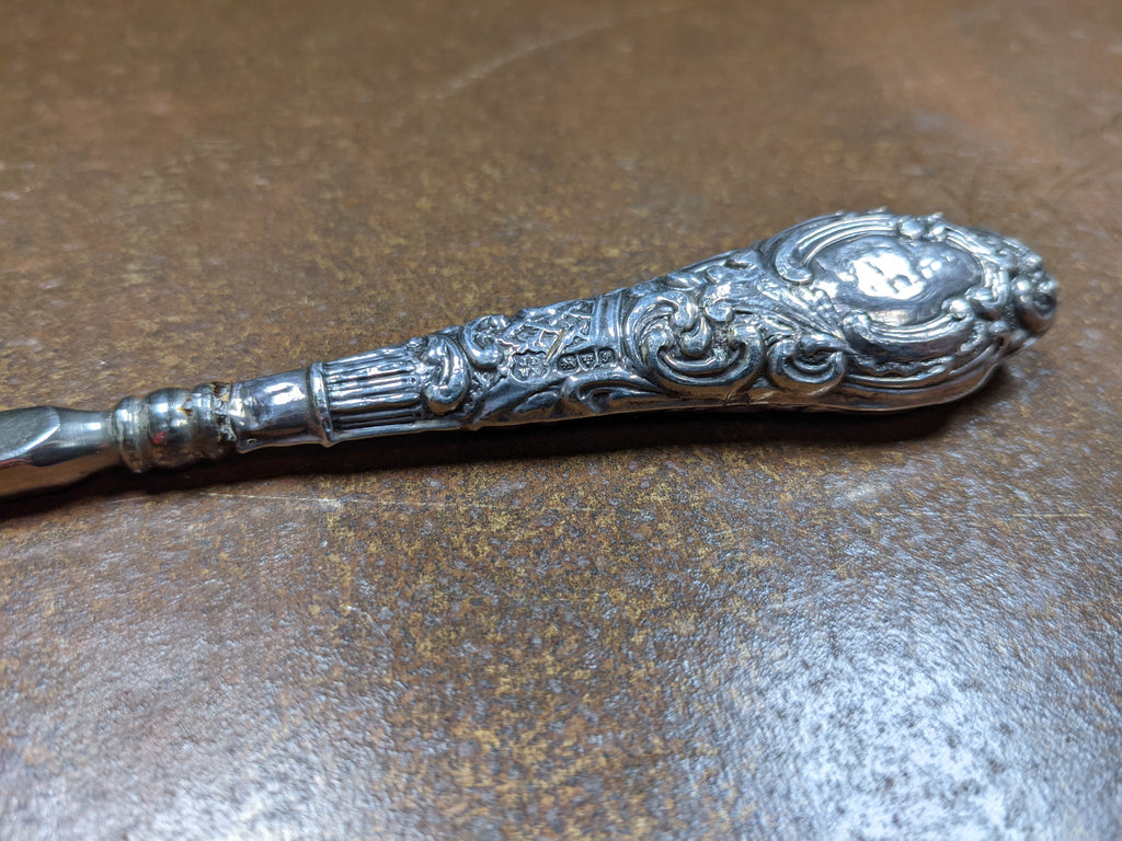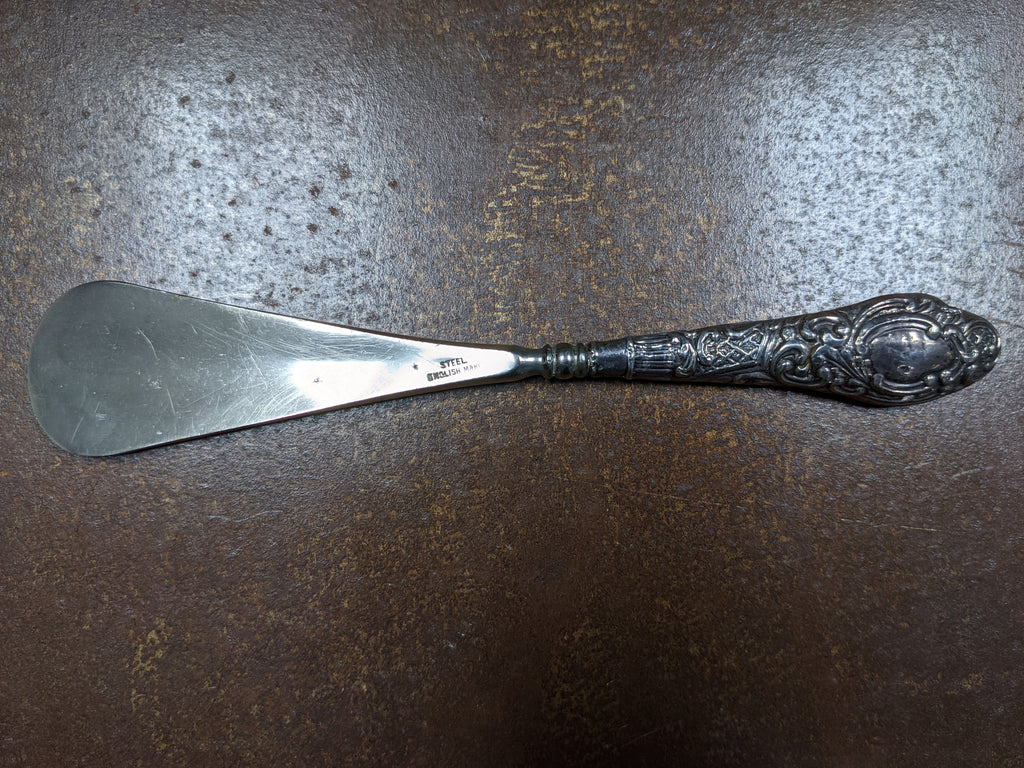 With an English steel blade and solid silver handle, this beautiful Chester made shoe horn measures approximately 8" length, approx 1½" width. Would make a lovely decorative piece or gift for a collector!