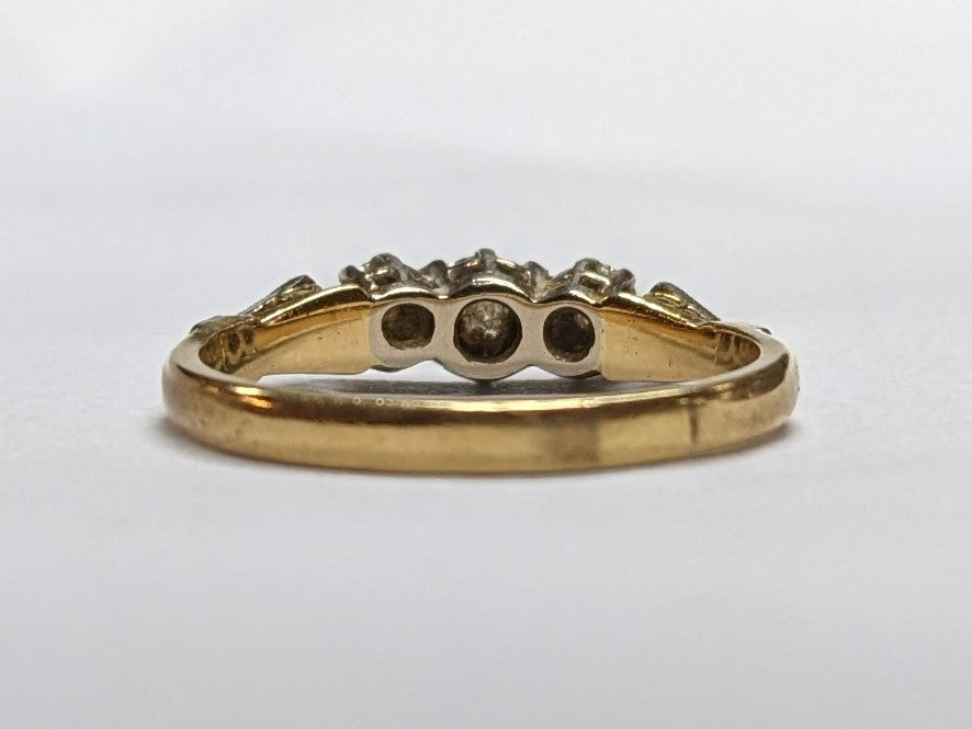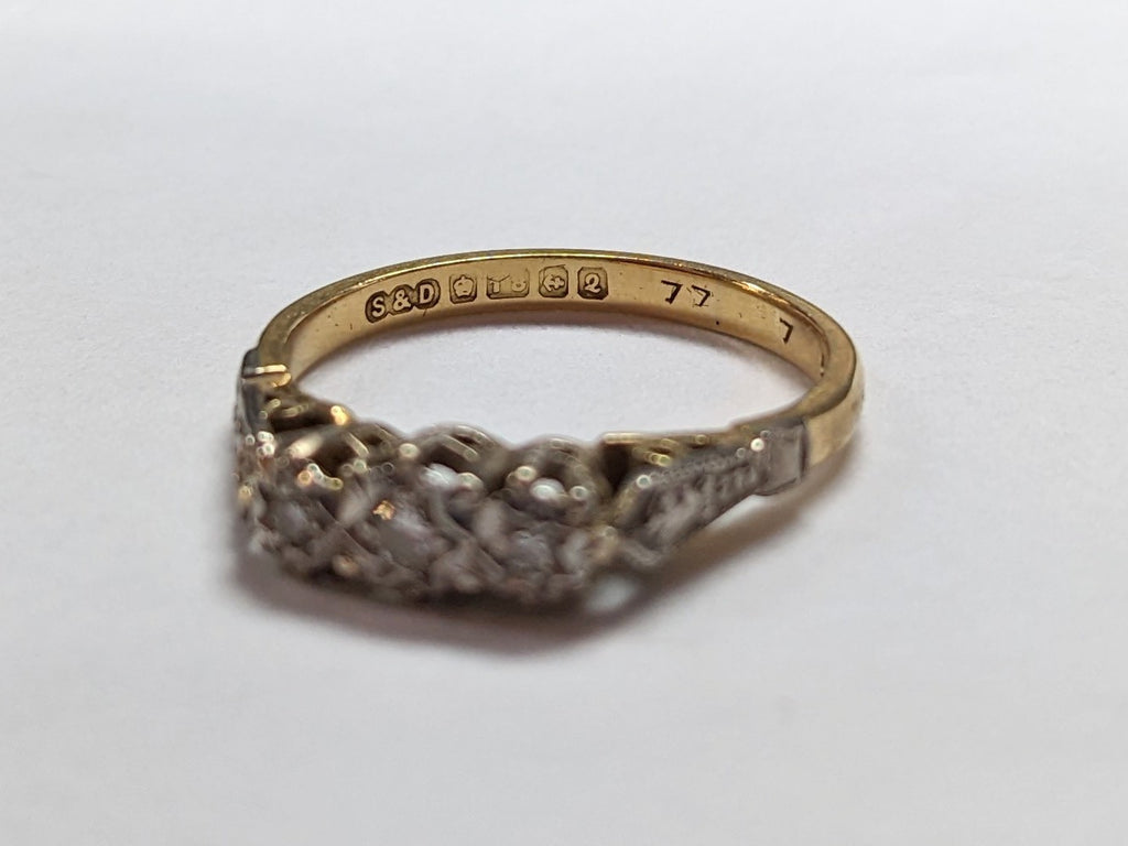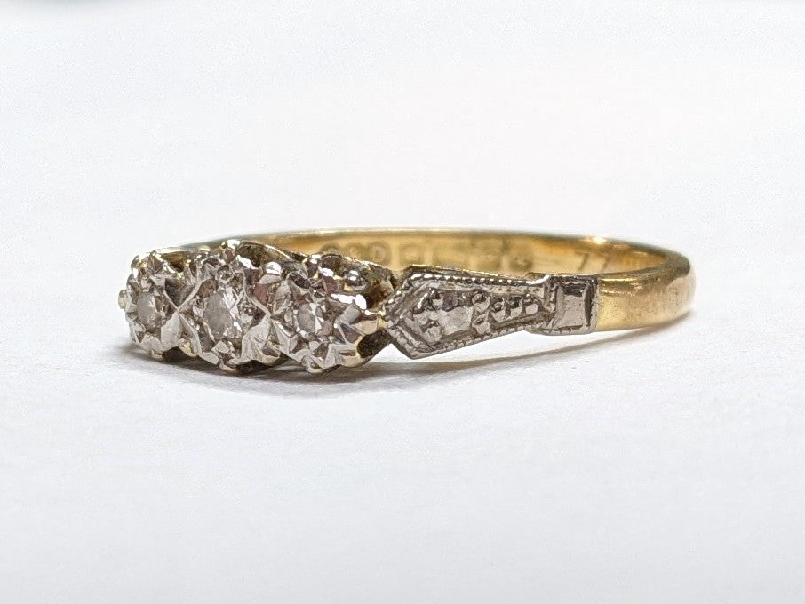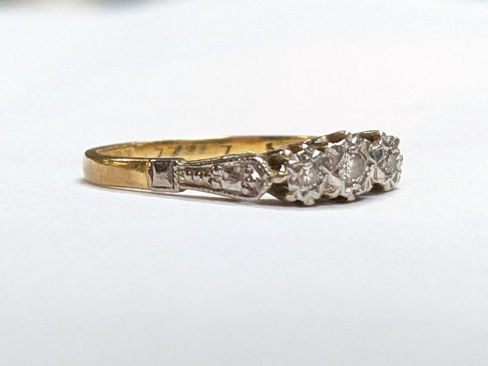 A simply stunning piece, this Birmingham-made 18ct gold ring is inlaid with three diamonds, bears hallmarks dating it from 1965-1966, and was made by Steele & Dolphin. The most dazzling accessory to make your hand truly sparkle!