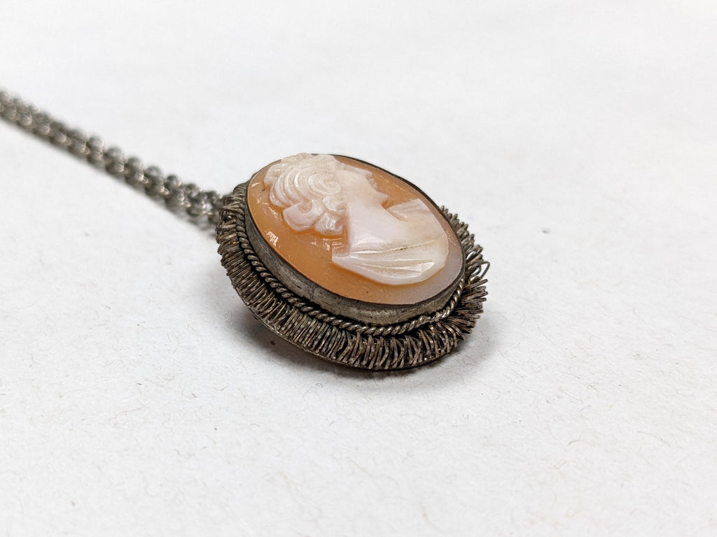 Hand carved from shell and inlaid in a base metal fitting, this gorgeous cameo is the perfect gift or addition to a collection! Can be worn either as a necklace or brooch.