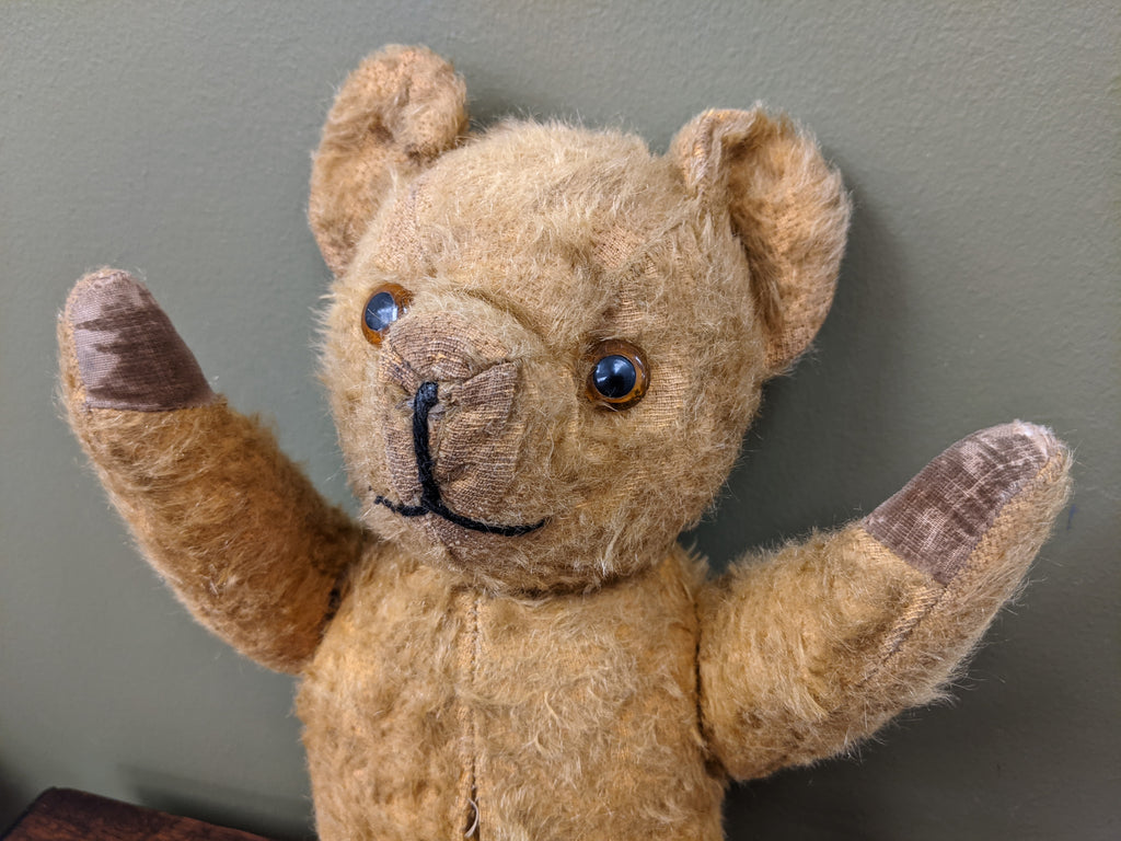 Complete with original glass eyes and straw stuffing, this early growling teddy bear’s hairy exterior and functional moving limbs are just as delightful as when first made!