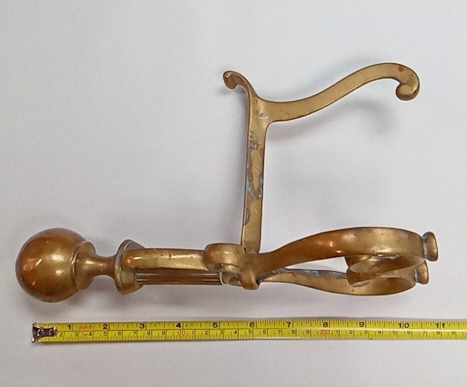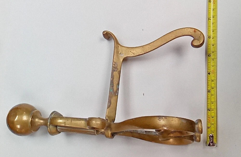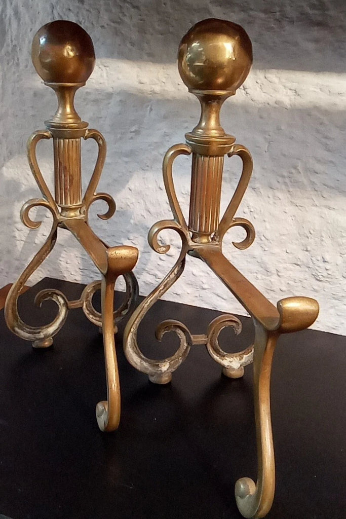 A classic pair of brass fire dogs, perfect for completing a traditional fireplace setting. Standing at approximately 10.5 inches tall at their highest point, these timeless pieces of fireside furniture are both decorative and functional.