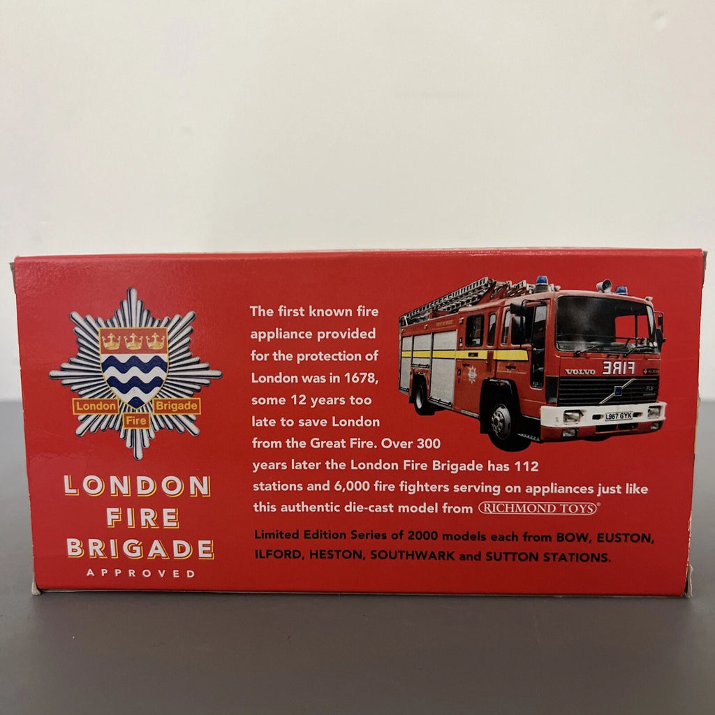 These boxed diecast models depict a London Fire Brigade Volvo emergency vehicle, produced by Richmond Toys as part of their Limited Edition Fire Engine series.
